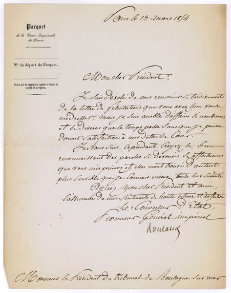 4to. 1 p. on bifolium. Together with an autograph envelope signed. To thank the president of the court of Boulogne-sur-Mer for a letter of congratulations: "Je suis désolé de vous remercier si tardivement de la lettre de félicitations que vous avez bien voulu m'adresser ; mais je suis accablé d'affaires si nombreuses et si diverses que le temps passe sans que je puisse donner satisfaction à mes dettes de Cœur [.]." - On stationery of the public prosecutor's office of the Imperial Court of Paris. - The envelope was addressed to the unnamed Minister of Finance during Rouland's tenure as Governor of the Bank of France (1864-1878). - Both with some browning and minimal tears.