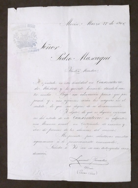 Lettera a Pietro Mascagni Carta intestata Conservatorio Mascagni 1906 Argentina