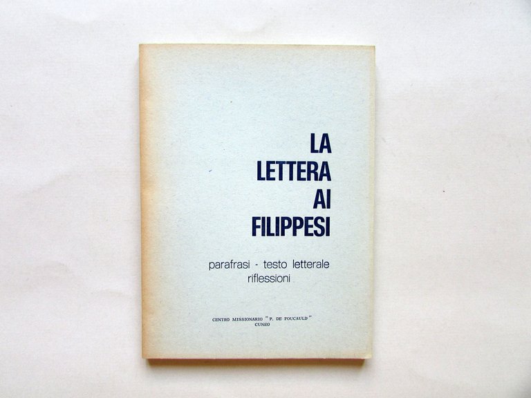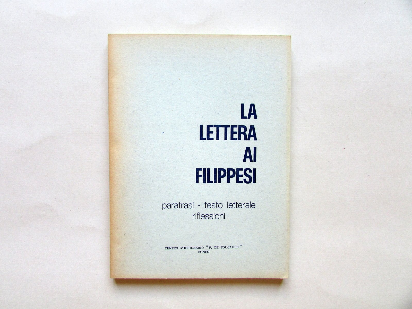 La Lettera ai Filippesi parafrasi - testo letterale - riflessioni Centro Missionario P. De Foucauld, Torino, s. d.; cm 21,5x15,5; pp. 112; testo a stampa a caratteri dattiloscritti; brossura ed. Condizioni di conservazione Buone condizioni con minime tracce d'uso, dorso leggermente ingiallito. Interni molto ben conservati. Edizione fuori commercio. SETT30.L26652 N