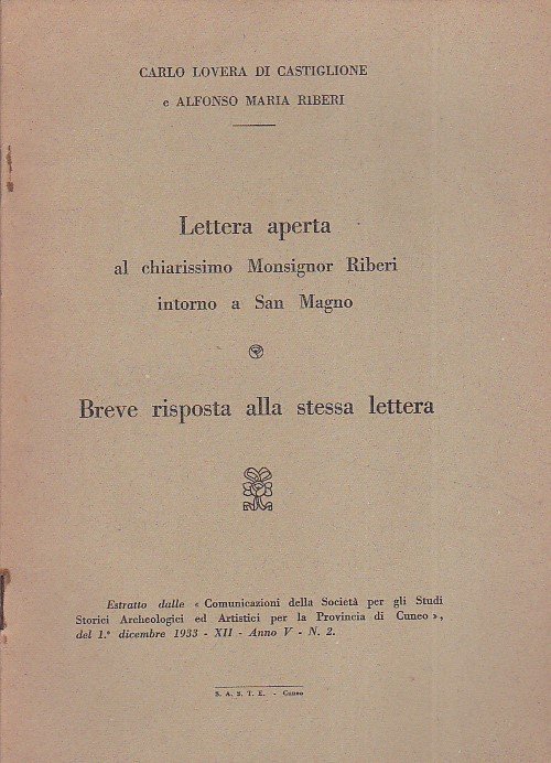 Lettera aperta al chiarissimo Monsignor Riberi intorno a San Magno. Breve risposta alla stessa lettera. Estratto dalle 'Comunicazioni della Società per gli Studi Storici Archeologici ed Artistici per la Provincia di Cuneo', del 1° dicembre 1933 - XII - anno V - n. 2