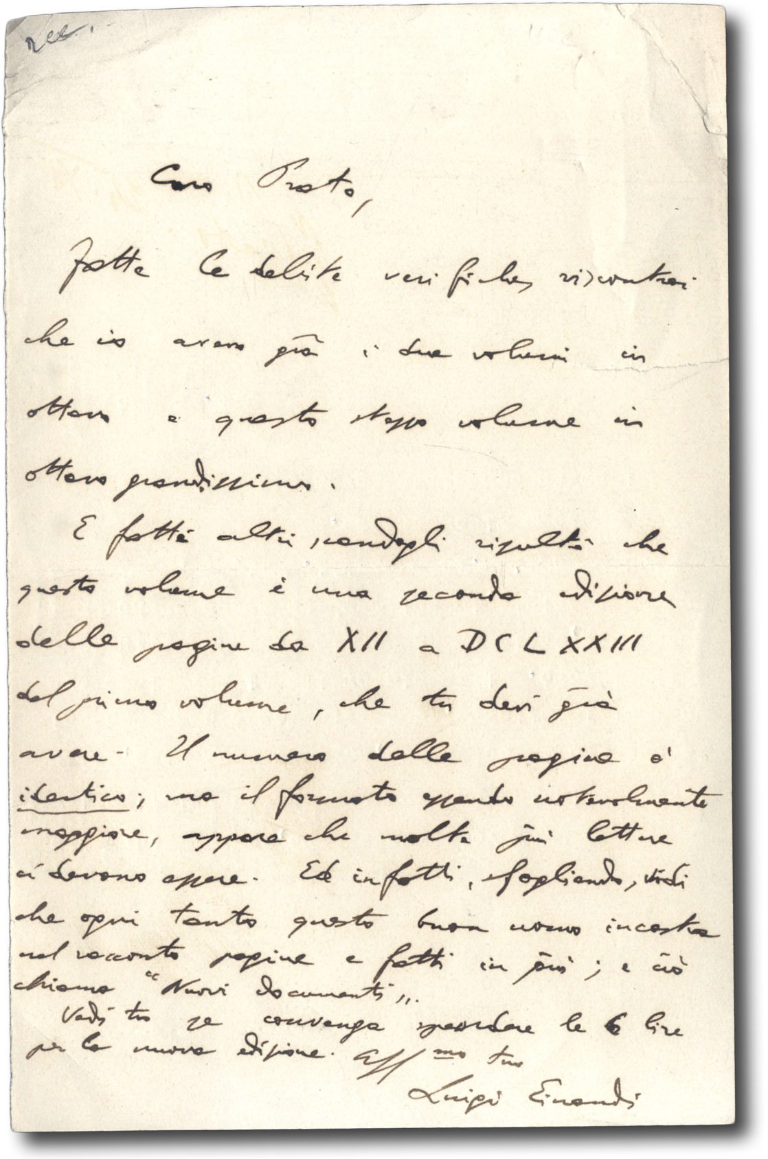 >1 pagina in-8, indirizzata a ''Caro Prato'', da identificarsi con Giuseppe Prato (1873-1928) uno dei principali esponenti della scuola di economisti formatasi tra la fine dell'Ottocento e gli inizi del Novecento nell'ambito del "Laboratorio di Economia Politica" diretto da Cognetti de Martiis e che ebbe tra i suoi rappresentanti più autorevoli il futuro Presidente della Repubblica. Einaudi confronta due edizioni di un volume che non specifica e commenta ''Ed infatti sfogliando vidi che ogni tanto questo buon uomo incastra nel racconto pagine e fatti in più, e ciò chiama ''nuovi documenti''. Vedi tu se convenga spendere le 6 lire per la nuova edizione''.