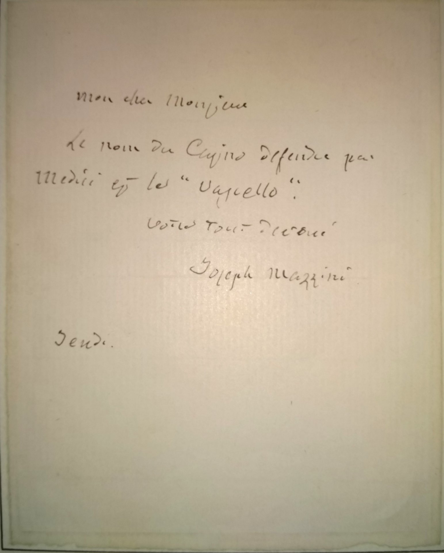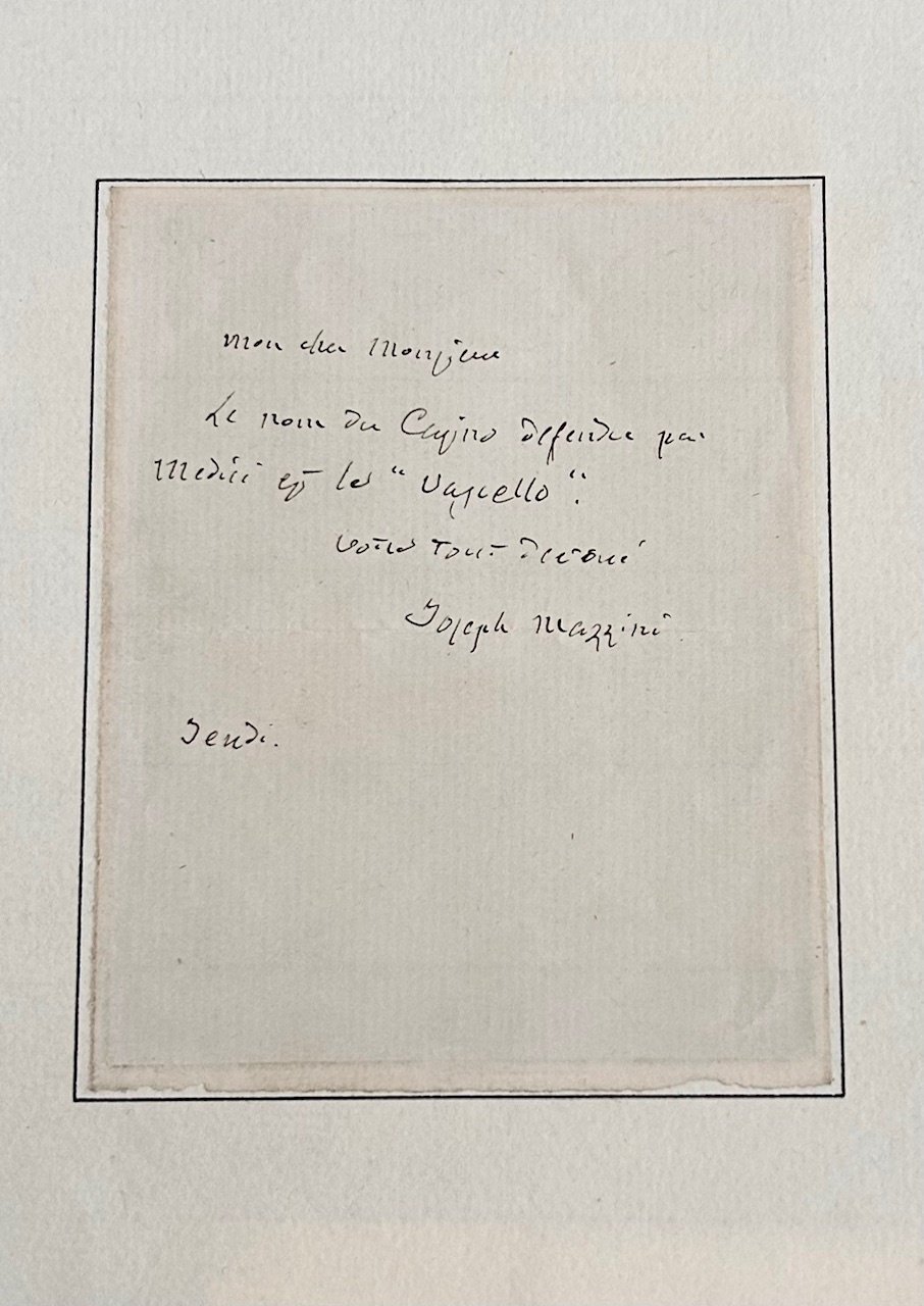 >Biglietto autografo firmato (114x90mm ), breve e telegrafico scritto in francese firmato ''Joseph Mazzini'' . Testimonianza estremamente importante relativa all'eroica impresa che Giacomo de' Medici fece nel tentativo di difendere Roma dall'attacco delle truppe francesi. Il battaglione comandato dal Medici, il 3 giugno 1849 si trincerò nel fabbricato di villa Giraud, detta, per la forma simile alla prua di una nave, «del Vascello». L'eroica difesa e il coraggio dimostrato gli valsero il grado di luogotenente colonnello, la medaglia d'oro al valore e, nel 1876, il titolo di Marchese del Vascello. ''...Le nom du Casino defendu par Medici est le ''Vascello''. Ottimo esemplare applicato su un foglio di dimensioni maggiori.
