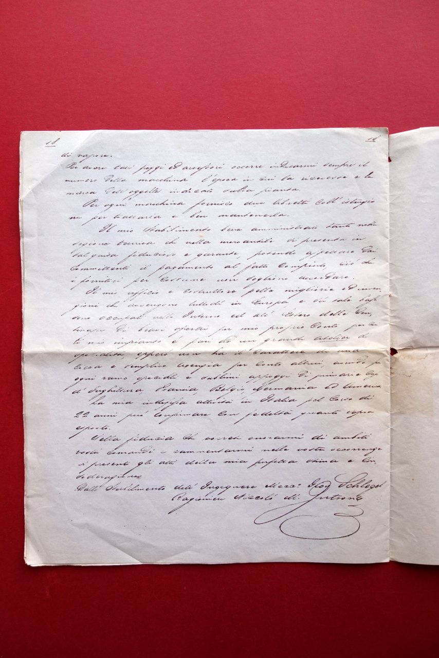 Lettera in litografia, Giovanni Schlegel Macchine agricole - trebbiatura a vapore - locomobili - aratri Milano, 1862 Milano, 1862; lunga lettera in litografia di pp. 18, in cui sono descritti vari macchinari destinati a uso agricolo; fogli uniti al dorso mediante cordella di legatura. Cm 27x23. Condizioni di conservazione Esemplare in buone condizioni con tracce d'uso, traccia di piega centrale di conservazione, angolo superiore destro con traccia di piega. Un piccolo strappetto alla cuffia superiore. Leggero ingiallimento in corrispondenza della piega conservativa. Lunga lettera molto interessante, di uno dei primi 2-3 stabilimenti per la costruzione di macchine agricole in Italia. SC03.D17138 N