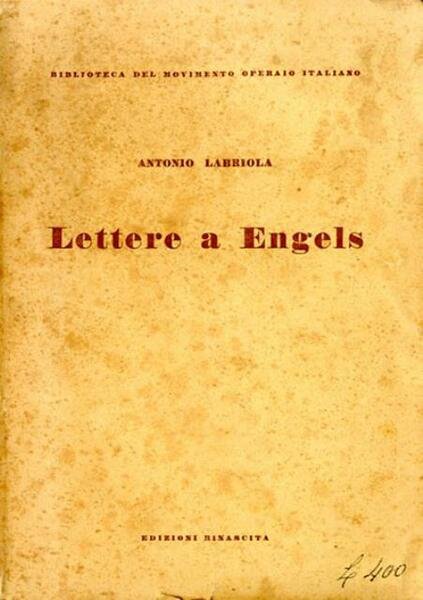 XIV, 237 p. ; 22 x 16 cm. Biblioteca del movimento operaio italiano, 1. Antonio Labriola è stato un filosofo e uomo politico, tra i massimi studiosi italiani del marxismo. Dopo aver iniziato lo studio sistematico dei testi di K. Marx e F. Engels, s'impegnò in un'opera di divulgazione che risultò in realtà una elaborazione originale: egli polemizzò contro le interpretazioni positivistiche e deterministiche e contro la riduzione del marxismo a una filosofia della storia («Del materialismo storico: dilucidazione preliminare», 1896). Il suo insegnamento ha lasciato una traccia profonda nella cultura italiana anche per l'influenza esercitata, con diversi esiti, su Croce e su Gramsci. Questa raccolta di lettere («Lettere ad Engels», pubblicate la prima volta tra il 1924 e il 1929) è una preziosa testimonianza dell'approccio del filosofo italiano allo studio sistematico delle opere di Marx e di Engels. Brossura editoriale, coperta in cartoncino flessibile colorato (grigio) con impresso il titolo in blu al piatto e al dorso. Qualche segno del tempo ai profili e alla coperta, pagine interne e taglio ingialliti per il resto esemplare integro. Codice libreria 8042.