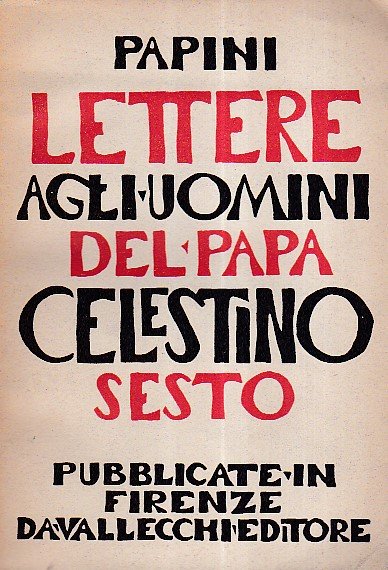 In-8°, pp. 291, (3), brossura editoriale con titolo in rosso e nero. Qualche brunitura dovuta alla qualità della carta ma buon esemplare Prima edizione. 'Un grande Papa, Celestino VI. ha rivolto a tutti gli uomini la sua appassionata parola di ammonimento, d'illuminazione e di speranza. L'Autore finge di aver trovato il testo latino di queste lettere e di averle tradotte'. Spaducci, p. 214. Gambetti / Vezzosi, p. 626.
