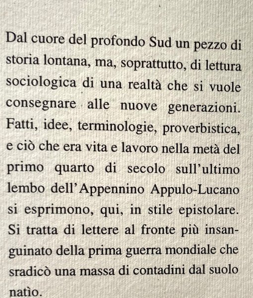 Dal cuore del profondo Sud un pezzo di storia lontana, ma, soprattutto, di lettura sociologica di una realtà che si vuole consegnare alle nuove generazioni. Fatti, idee, terminologie, proverbistica, e ciò che era vita e lavoro nella metà del primo quarto di secolo sull’ultimo lembo dell’Appennino Appulo-Lucano si esprimono, qui, in stile epistolare. Si tratta di lettere al fronte più insanguinato della prima guerra mondiale che sradicò una massa di contadini dal suolo natìo.