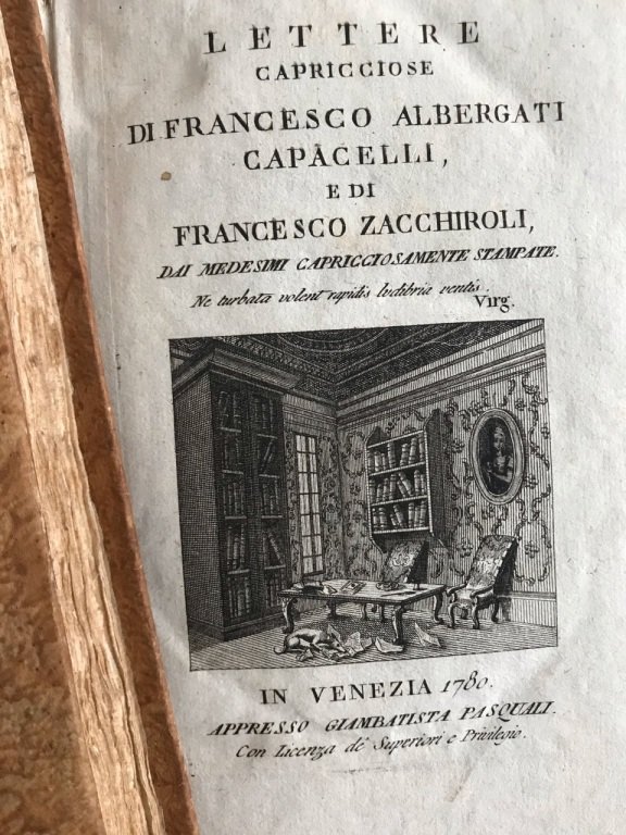 <span style="font-style: normal;">2 volumi in-8° (cm. 20,8), genuine legature coeve in cartonato marmorizzato con titolo in oro al dorso; pp. [2] 276, [2] 365 in barbe, in stato molto buono, con 2 diverse e graziosissime vignette in rame ai frontespizi; lievissime fioriture, minuscola macchia d'inchiostro al margine di un paio di carte in fine al primo volume, </span><i>Ex libris</i> impresso. Edizione originale del tentativo del commediografo Capacelli (1728-1804), vanto della drammaturgia bolognese, e del poeta Zacchiroli (1750-1826), massone, di creare insieme un genere epistolario divertente su argomenti seri. Esemplare molto buono. (NG3)