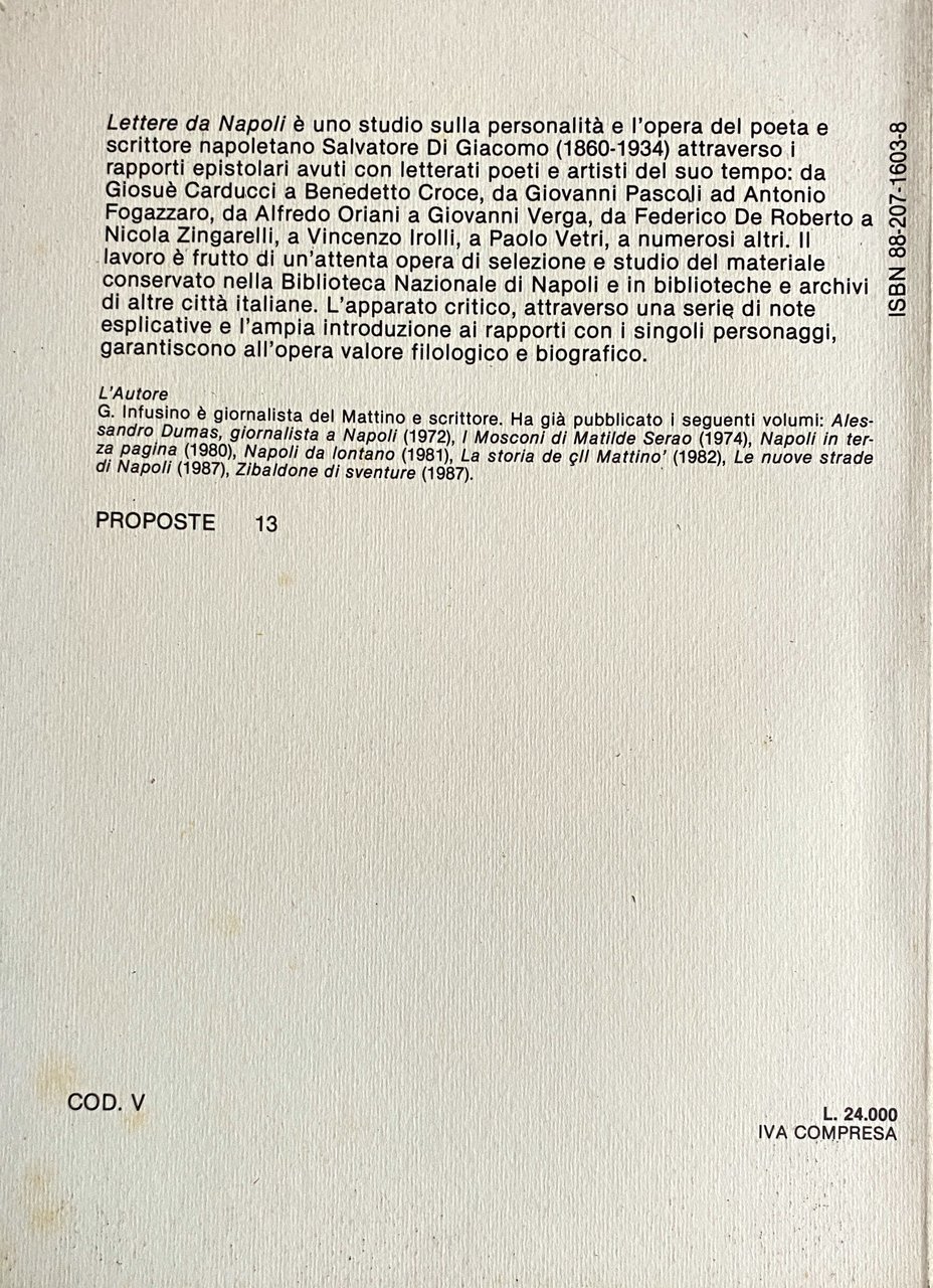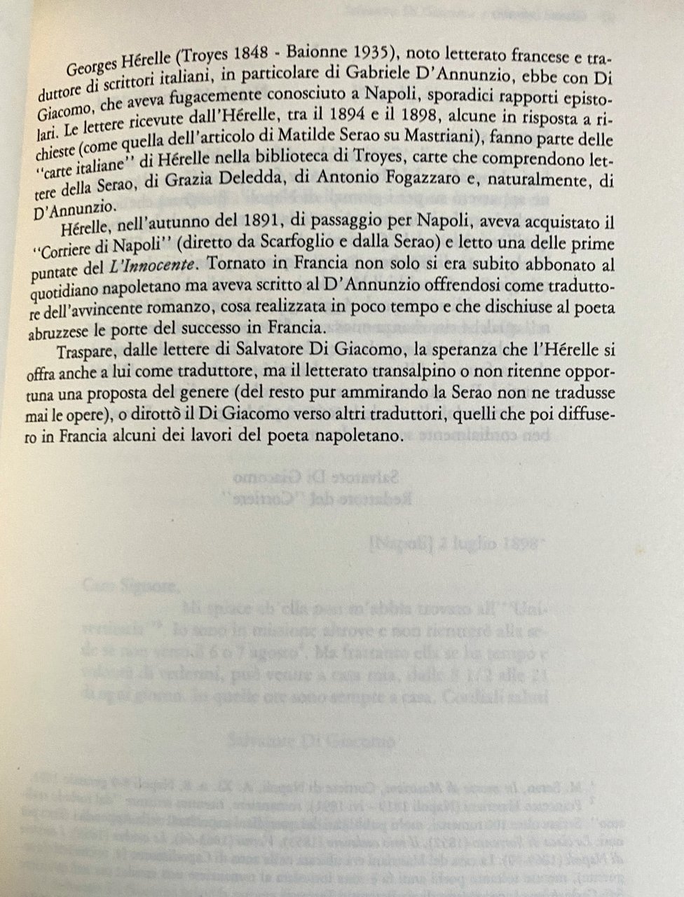 Soggetti: Critica letteraria Saggi Letteratura italiana Lettere Carteggi Napoli Nobilissima Dialetto napoletano Poesia dialettale Ottocento Novecento Ernesto Murolo Libero Bovio E A Mario Canzone napoletana Marechiaro Era de maggio Assunta Spina Biografie Filologia Matteo Renato Imbriani Arturo Piazza Angelo De Gubernatis Onorato Fava Benedetto Croce Roberto Bracco Francesco Gaeta Riccardo Ricciardi Georges Hérelle Lionietti Luccio Montuori Di Martino Lucchesi Palla Ademollo Corrispondenza Relazioni sociali Elisa Avigliano Carte Armando Diaz Biblioteca napoletana Alfredo Oriani Scritti Inediti Collezionismo Libri rari fuori catalogo Archivio Literary Criticism Essays Italian Literature Letters Correspondence Neapolitan Dialect Poetry Nineteenth Century Twentieth Century Neapolitan Songs Letterati francesi Gabriele D'Annunzio Articoli Recensioni Matilde Serao Francesco Mastriani Carte italiane Grazia Deledda Antonio Fogazzaro Corriere Scarfoglio L'Innocente Traduttori Castelvecchio Federigo De Roberto Cartoline Malavita Scene popolari napoletane Carteggio Fantasio Quotidiani Riviste Cronaca Intellettuali Manifesto Fascismo Congresso Bologna Luigi Barzini Guido da Verona Ferretti Lorenzo Giusso Dario Niccodemi Ugo Ojetti Alfredo Panzini Luigi Pirandello Corrado Ricci Ferdinando Russo Gioacchino Volpe Mussolini Carlo Nazzaro Fausto Nicolini Il ventre di Napoli Memorie Vita Poeti napoletani Classici Giovanni Verga Giosuè Carducci Giovanni Pascoli Nicola Zingarelli Anton Giulio Bragaglia Giannino Antona Traversi Alessandro Ademollo Leopoldo Lucchesi Palli Vincenzo Irolli Luca Postiglione Paolo Vetri Vincenzo Migliaro Raffaele Montuoro Riccardo Bocchini Gaspare Di Martino Giuseppe Consoli Fiego Coniugi Lionetti Giovanni Luccio Moglie Viaggio Scrittori Amicizie Gino Doria Il Mattino Intellettuali fascisti Manoscritti Musica Musicologia Costantino Del Franco Palazzo Reale