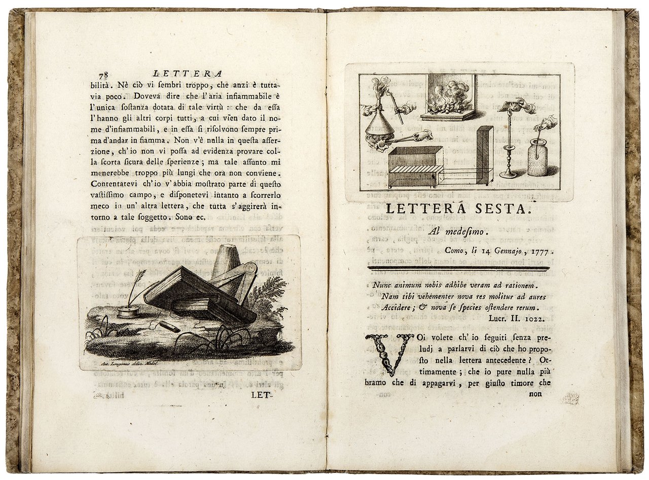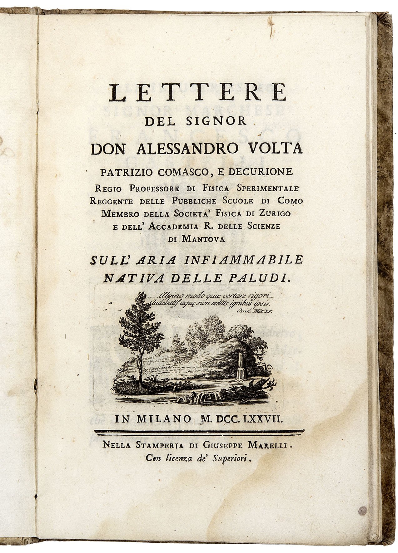 EDIZIONE ORIGINALE di questo importante trattato, composto di sette lettere, nel quale l'autore espone a Carlo Giuseppe Campi le ricerche da lui compiute sul gas che risale dalle paludi (metano), che in precedenza non era stato distinto dall'idrogeno. L'opera stimolò i ricercatori a nuovi esperimenti che portarono successivamente alla scoperta della composizione dell'acqua.