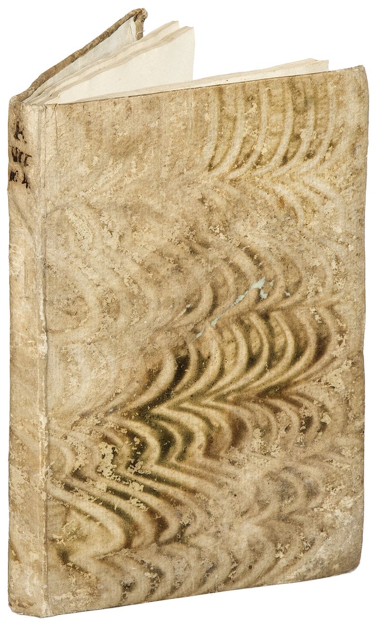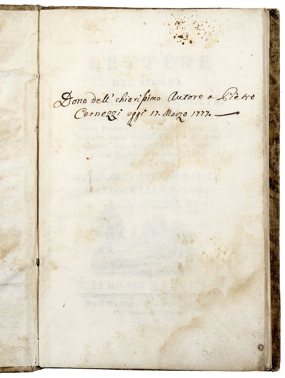 In 8vo (mm. 201x126); pp. 147, (1), c. (1) aggiunta successivamente. Segnatura: a-h8 i10 [χ]1. Vignetta calcografica al frontespizio accompagnata dal motto: “Alpino modo quae certare rigori. Audebatis aque non cediti ignibus ipsis”. Armi del dedicatario, il marchese Francesco Castelli, alla carta a2r. Con inoltre 12 finissime incisioni su rame nel testo, alcune delle quali raffiguranti degli esperimenti. Capilettera xilografici. Al recto dell'ultima carta, aggiunta probabilmente in un momento successivo alla pubblicazione, è stampato: “Didicistis, nihil forte im Physicis intellectu difficilius, quam quidnam proprie sit illud corporei, quod unice combustils sit in materia combustili. Boerh. de Alim. dic. Ign. Exp. XIII.”. Alone all'angolo inferiore destro dei fascicoli a-f, che progressivamente tende ad attenuarsi, ed alone all'angolo superiore sinistro dei fascicoli a-c. Cartoncino coevo colorato un po' sbiadito, lievi abrasioni. Nota manoscritta al dorso. Buona copia genuina. Dedica manoscritta autografa dell'autore al risguardo anteriore (“Dono dell' chiarissimo Autore a Pietro Cernezzi oggi 17. Marzo 1777.”). I Cernezzi, famiglia decurionale già presente a Como nel 1447, ottennero il 28 gennaio 1817, con una sovrana risoluzione, la conferma della propria nobiltà. Pietro, membro del Consiglio Comunale di Como nel 1813 (Bollettino delle Leggi del Regno d'Italia. Parte II. N° 17 al N° 22), ebbe una lunga relazione epistolare con il Volta.