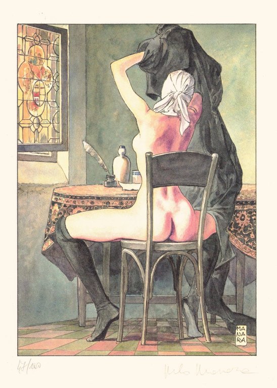 In-8 gr., tela editoriale, titolo oro su tassello al piatto, custodia in tela, pp. 55,(9), con tavole a colori nel testo e 1 litografia originale a colori di Milo Manara, tirata sui torchi della Spirale su carta Magnani di Pescia a cento esemplari firmati e numerati (47/100).Testo in italiano con traduzione francese a fronte a cura di Brunella Schisa. In ottimo stato.