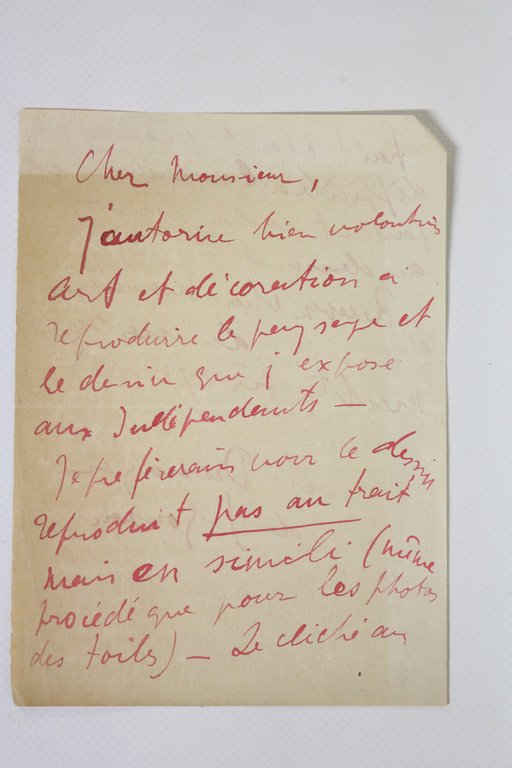 Lettre autographe signée concernant la reproduction de deux de ses oeuvres dans une revue