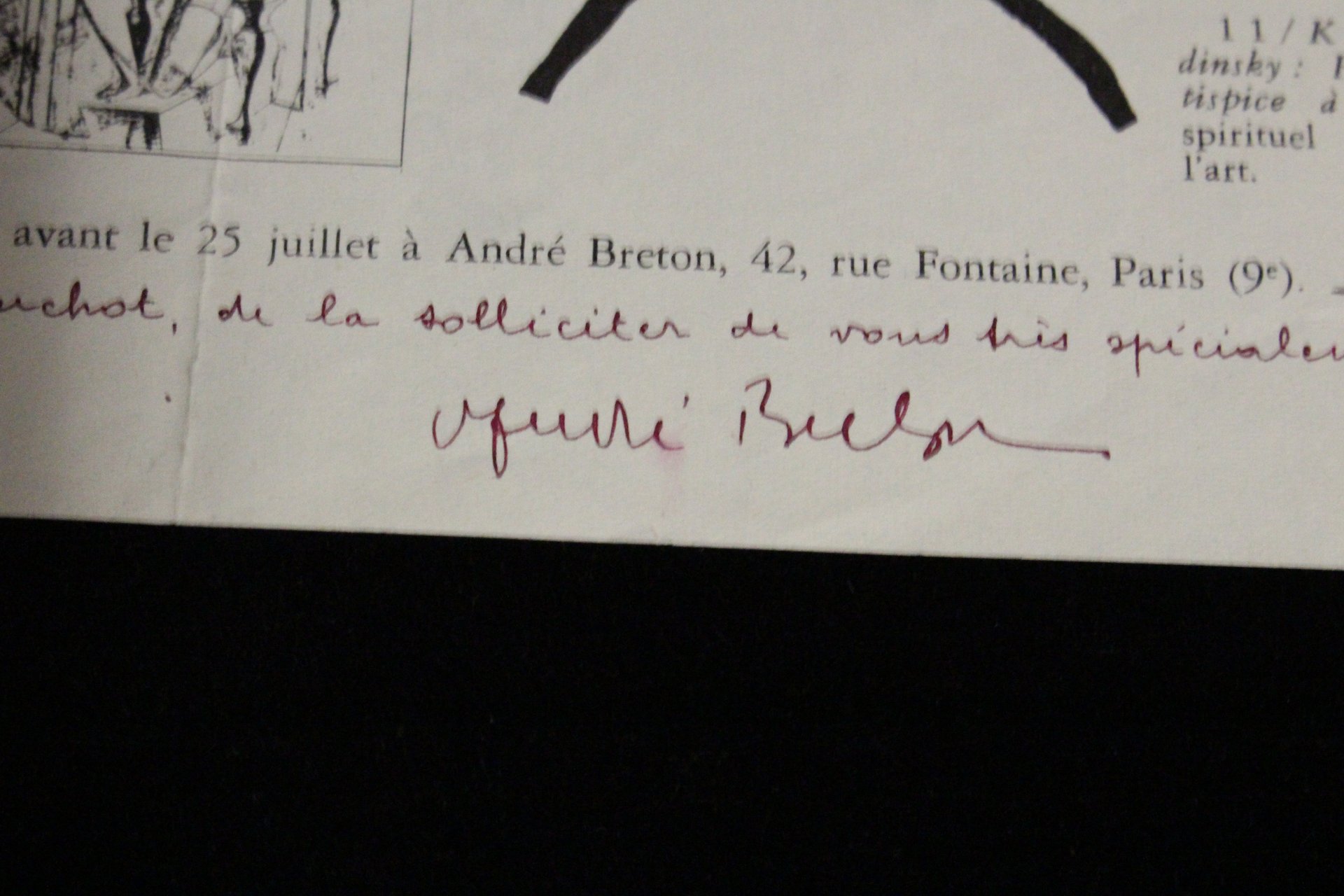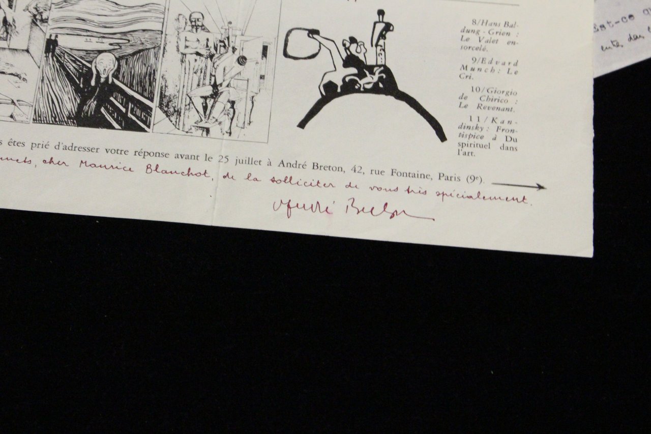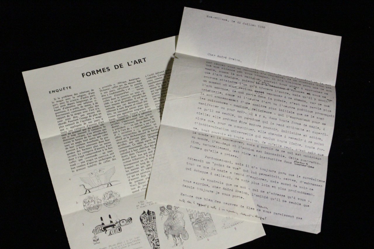 22 juillet 1955 | 26.50 x 20.70 cm | un feuillet | Typescript draft of a letter to André Breton, with autograph corrections and one line written by hand, with a questionnaire addressed to Blanchot by André Breton concerning magical art, with one line written by hand and signed. One 4to leaf, recto only, with corrections and a line in black ink in the hand of Maurice Blanchot, and another 4to leaf (27,5 x 21,5 cm) printed and illustrated in black, recto-verso, with a hand-written line and signature by André Breton in purple ink. When, in 1955, André Breton wrote to Maurice Blanchot, the two men already knew each other and had spent time together, developing a mutual appreciation but always keeping a respectful distance. Breton was working at the time on his important book L'Art magique [Magical Art] (Paris, 1957) and it was for this work that he undertook a huge survey of eighty figures (mainly artists, but also sociologists, ethnologists, philosophers, art historians, critics, and so on), including Blanchot. In order to conduct this survey, Breton published a tract entitled “Formes de l'art [Forms of Art]” illustrated with twelve images (of Egyptian, Gallic, Pre-Columbian, and Oceanian art as well as tarot, Paolo Uccello, etc.) which showed his progress and ended in a series of five questions on the links between art, magic, and modernity. “I am taking the liberty, my dear Maurice Blanchot, of asking for [your responses ] most particularly. André Breton “. On the 22nd July, Blanchot replies, ”It has always seemed to me that the word ‘magic', like the word ‘religion' can help us to approach what art truly represents, since in certain eras we could get to one via the other; but there was a moment when we had to forsake that path, and it is as though the thing for which art is the harbinger, the thing that speaks in poetry, is a more profoundly original word. It is as if works of art or poetry enunciated a beginning in a more fundamental way than the power – magic or religious – that they took on in order to manifest themselves or act. “Like the answers of other respondents, Blanchot's text was to appear in L'Art magique. A very interesting collaboration between Maurice Blanchot and André Breton on the subject of magic. * [FRENCH VERSION FOLLOWS] | Brouillon tapuscrit de lettre à André Breton, avec des corrections et une ligne autographes, et questionnaire adressé à lui par André Breton sur l'art magique, avec une ligne et la signature autographes. Un feuillet in-4 tapuscrit, recto seul avec des corrections et une ligne à l'encre noire de la main de Maurice Blanchot, et un feuillet in-4 (27,5 x 21,5 cm) imprimé et illustré en noir, recto-verso avec une ligne et la signature autographes à l'encre violette d'André Breton. Quand, en cette année 1955, André Breton écrit à Maurice Blanchot, les deux hommes se connaissent, se côtoient et s'apprécient depuis longtemps, tout en conservant une forme de distance respectueuse. Breton travaille alors à son important ouvrage L'Art magique (Paris, 1957) et dans ce cadre, réalise une vaste enquête auprès de quatre-vingts personnalités (artistes, mais aussi sociologues, ethnologues, philosophes, historiens de l'art, critiques, etc.), parmi lesquelles Blanchot. Pour ce faire, Breton édite un tract intitulé « Formes de l'art » - illustré de onze figures (art égyptien, gaulois, précolombien, océanien, tarot, Paolo Uccello, etc.) - qui présente sa démarche et s'achève sur une série de cinq questions portant sur les liens entre art, magie et modernité : « Je me permets, cher Maurice Blanchot, de solliciter [votre réponse] très spécialement. André Breton ». Le 22 juillet, Blanchot lui répond : « Il m'a toujours paru que le mot magie, comme le mot religion, pouvait nous aider à approcher ce que l'art désigne, puisqu'à certaines époques nous ne pouvons atteindre l'un qu'à travers l'autre, mais qu'il y avait un moment où nous devions renoncer à ce chemin, car ce que l'art annonce, ce qui parle