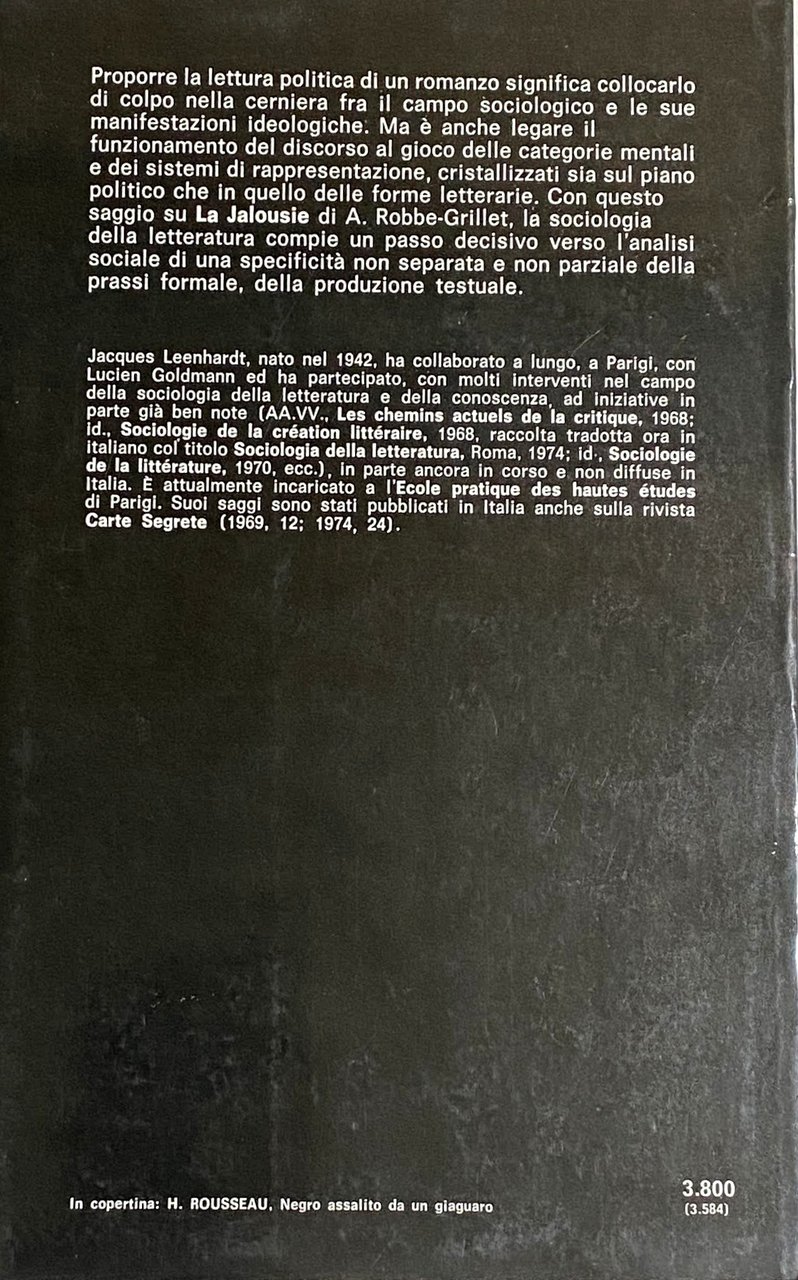 Proporre la lettura politica di un romanzo significa collocarlo di colpo nella cerniera fra il campo sociologico e le sue manifestazioni ideologiche. Ma è anche legare il funzionamento del discorso al gioco delle categorie mentali e dei sistemi di rappresentazione, cristallizzati sia sul piano politico che in quello delle forme letterarie. Con questo saggio su La Jalousie di A. Robbe-Grillet, la sociologia della letteratura compie un passo decisivo verso l'analisi sociale di una specificità non separata e non parziale della prassi formale, della produzione testuale.