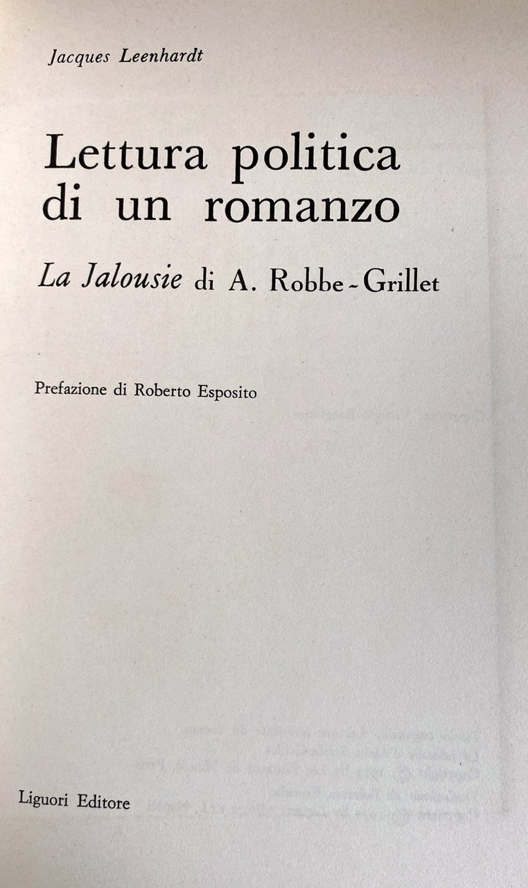 LETTURA POLITICA DI UN ROMANZO. LA «JALOUSIE» DI ALAIN ROBBE-GRILLET | Libros antiguos y modernos | Jacques Leenhardt, Roberto Esposito, Roberto Esposito
