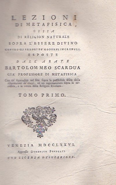 Lezioni di Metafisica ossia di Religion Naturale sopra l'Essere Divino contro gli errori de' moderni increduli, esposte. Con un'Appendice nel fine sopra la possibilità fisica della risurrezione de' corpi, ed un ragionamento sopra la necessità, e la verità della Religion Rivelata | Libros antiguos y modernos | Scardua Bartolommeo