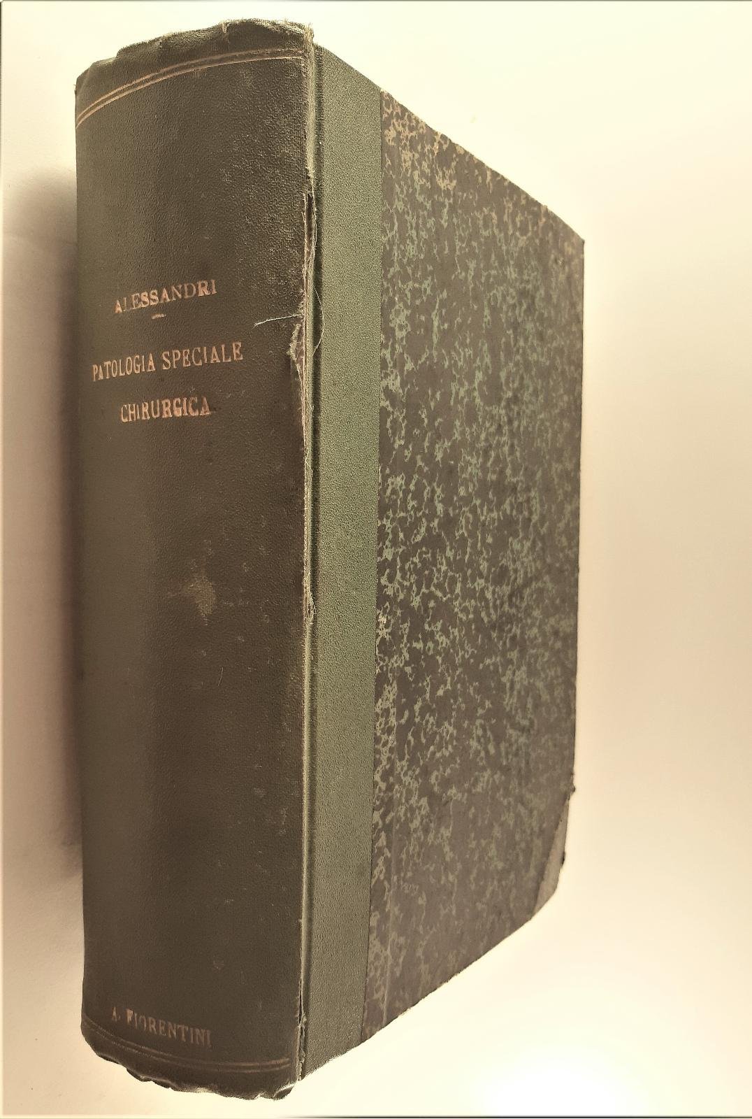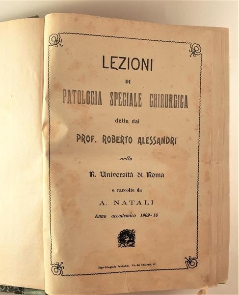 Lezioni di Patologia speciale chirurgica dette dal professor Alberto Alessandri nella regia Universit‡ di Roma e raccolte da Anna Natali anno accademico 1909-10 legatura rigida in mezzo tela con piatti marmorizzati e dorso in tela verde con titoli in oro, una rottura all'angolo inferiore del piatto anteriore, ai margini dei piatti, una rottura trapiatto anteriore e dorso cm 9,5, all'interno appunti scritti amano miniature grigia, ora al margine esterno, numero pagine 1095. Lezioni di patologia speciale chirurgica traumatologia dette dal professor Vincenzo Nicoletti nella regia Universit‡ di Roma e raccolte da A. Natali anno accademico 1909-10