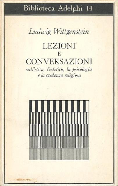 2. ed. 172 p. ; 22 x 14 cm. Biblioteca Adelphi. Nei testi raccolti in questo volume, tutti appartenenti al periodo compreso fra la pubblicazione del «Tractatus» (1921) e la composizione delle «Philosophische Untersuchungen» (1941-1949), Wittgenstein tratta alcuni temi fondamentali della ricerca filosofica: la natura del «bello» e delle proposizioni di fede, l’interpretazione psicologica, soprattutto in riferimento a Freud, e i fondamenti dell’etica, temi cioè che, pur presenti nell’unica opera da lui pubblicata e negli scritti postumi finora editi, non vi hanno né rilievo né trattazione particolare. Questi scritti, quindi, sia nella forma definitiva data da Wittgenstein stesso, come nella «Conferenza sull’etica», sia nella forma di appunti, presi da Friedrich Waismann durante e dopo conversazioni con Wittgenstein e Moritz Schlick, e da allievi durante lezioni tenute a Cambridge nel 1938, costituiscono un’aggiunta e un chiarimento indispensabili alla comprensione di una personalità filosofica così singolare e determinante per la nostra cultura. In particolare gli appunti, proprio per la forma diretta della conversazione filosofica, conservata nella trascrizione non elaborata dagli allievi, suggeriscono il modo di procedere della sua intelligenza creativa e il rigore non soltanto intellettuale della ricerca, poiché, come dice Erich Heller: «Per Wittgenstein, la filosofia non era una professione; era una passione divorante; e non solamente una passione, ma la sola forma possibile della sua esistenza: pensare di poter perdere la propria capacità di filosofare era per lui esattamente come pensare al suicidio». A cura di Michele Ranchetti. Brossura editoriale, coperta illustrata (b/n) in cartoncino flessibile con alette. Leggere sottolineature a matita rossa in alcune pagine, per il resto libro integro. Codice libreria 3586.