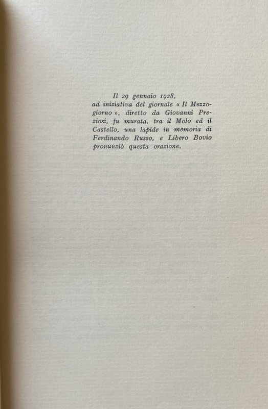 Dal giugno dell'ottantatré al maggio del quarantadue Libero Bovio, a cavallo del secolo, scrisse centinaia di canzoni, tutte "frecce" mirate ai sentimenti più nobili ed umani. Così, sorrise, pianse, si disperò, gioì, fuggì con la mente e ritornò col cuore, nella sua Napoli, cantata per lui, nel mondo vicino e lontano, fin quando, con la sua eterna sigaretta, passando fra le stelle della sua immaginazione, diede fuoco ad una nuvola ed inciampò nell'eternità. Ora, in via Duomo c'è una lapide, e chi passa per quella strada legge: "so' napulitano e sì nun canto i' moro".