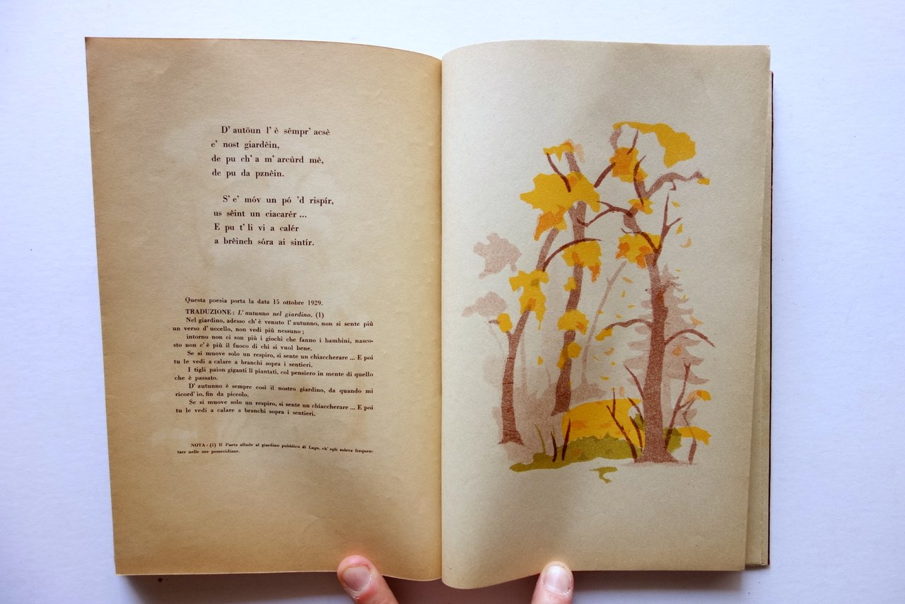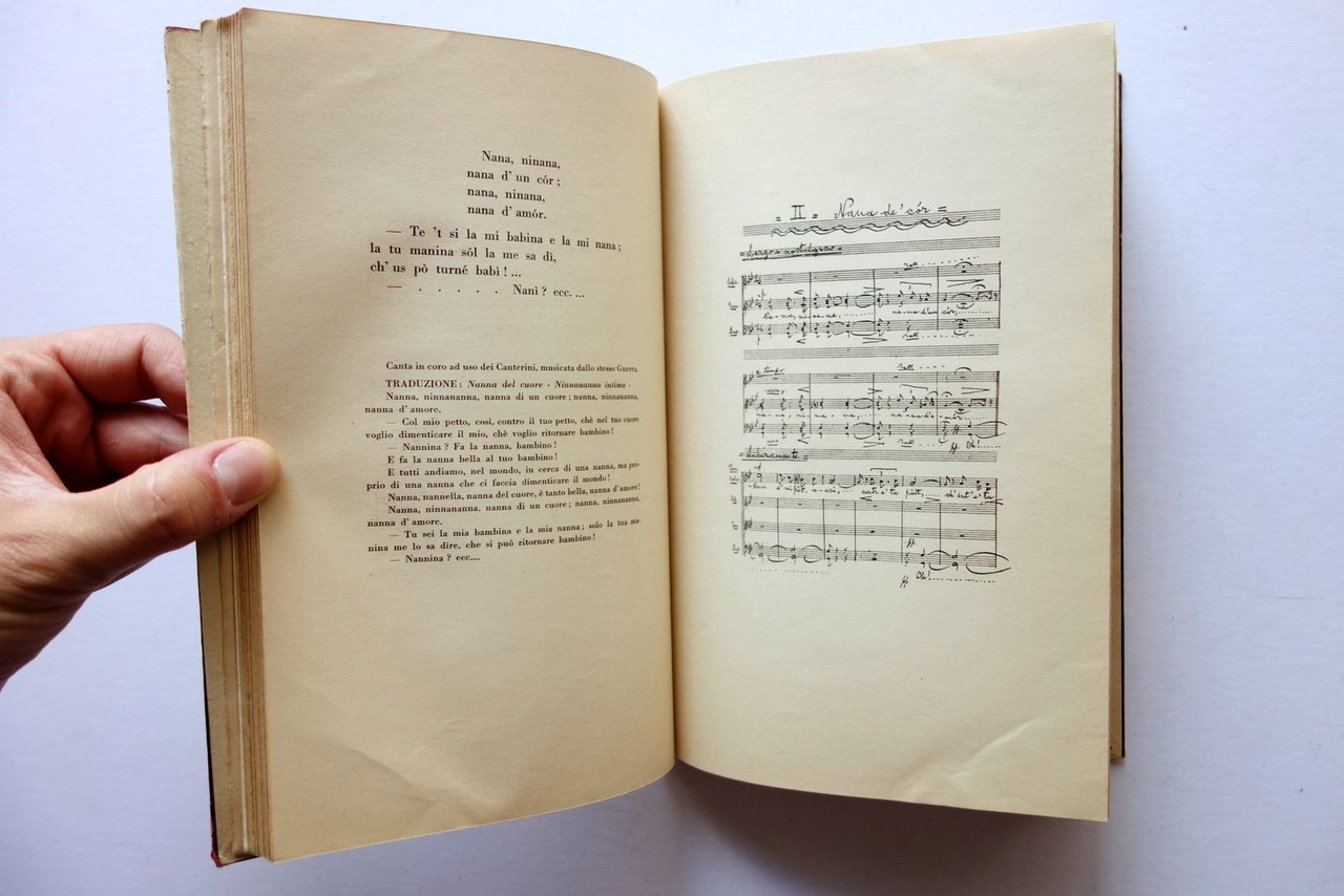 Lino Guerra, † Cante e Poesie pubblicazione postuma a cura degli amici con presentazione e note di F. Balilla Pratella Nell'Officina dei Ferretti, in Lugo 1931; cm 24x16,5; pp. 74 con 4 belle tavole a colori fuori t. di Edmondo Ferretti, 7 tavole in b/n corrispondenti a partiture musicali di F. Balilla Pratella (vedi foto), una ill. fotografica seppiata che ritrae il Guerra; pagine a doppio foglio chiuso. Legatura coeva in mezza tela muta. Al frontespizio timbro - ex libris del precedente proprietario. Accluso frammento della copertina originale, con al retro il colophon (vedi foto). † Condizioni di conservazione Esemplare in buono stato con tracce d'uso, coperta con alcune minuscole abrasioni ai piatti, qualche leggerissimo alone. Interni buoni con minimi principi d'ingiallimento. † Rarissima edizione originale delle cante e poesie" del Guerra, poeta nativo di Lugo e morto suicida a 40 anni. Opera molto bella e profonda, anche grazie all'introduzione del Balilla Pratella, arricchita dalle tavole a colori di Edmondo Ferretti. Stampato a doppio foglio chiuso. Conservatasi anche parte della copertina originale, con colophon al retro. Testi delle poesie in dialetto romagnolo, con traduzione in italiano. † SETT213.L19938 N "