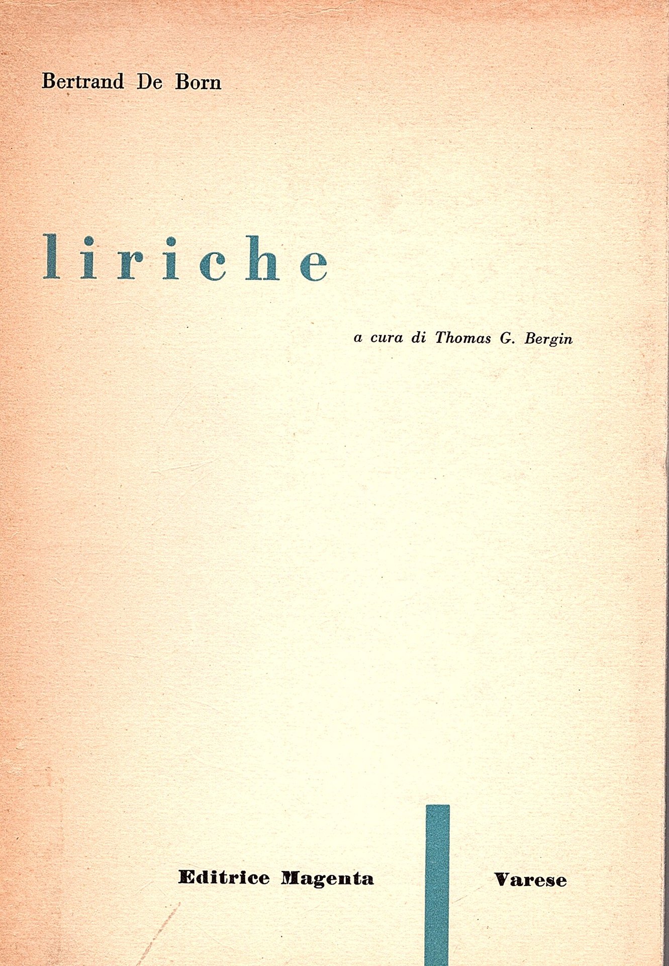 In-16° (18.5 x 13 cm), pp.115 (2), brossura editoriale ad alette paratestuali, con titoli bicromi su fondo chiaro, dorso verde con titolo in nero, leggera brunitura della carta, segni d'uso e qualche imperfezione al dorso. Per il resto buon esemplare in velina. Prima edizione di questa raccolta di liriche, perlopiù di argomento politico- guerresco di Bertrand De Born. Questi fu uno dei rari esempi di poeti di lingua d'Oc di cui rimangono delle tracce documentarie importanti. A. Thomas che pubblicò nel 1888 la sua opera, citò documenti provenienti dall'archivio del monastero di Dalon, dove Bertrand si ritirò in età matura. Scopriamo così che: ebbe due fratelli, fu piuttosto ricco ed influente ed ebbe rapporti politici con almeno tre re francesi. Fu anche efficace autore di versi ironici, beffardi e satirici anche in argomento amoroso. Collana Oggetto e Simbolo: n. 10