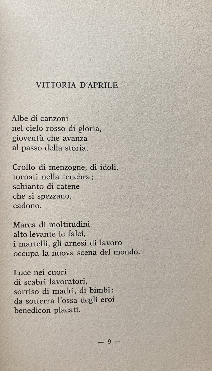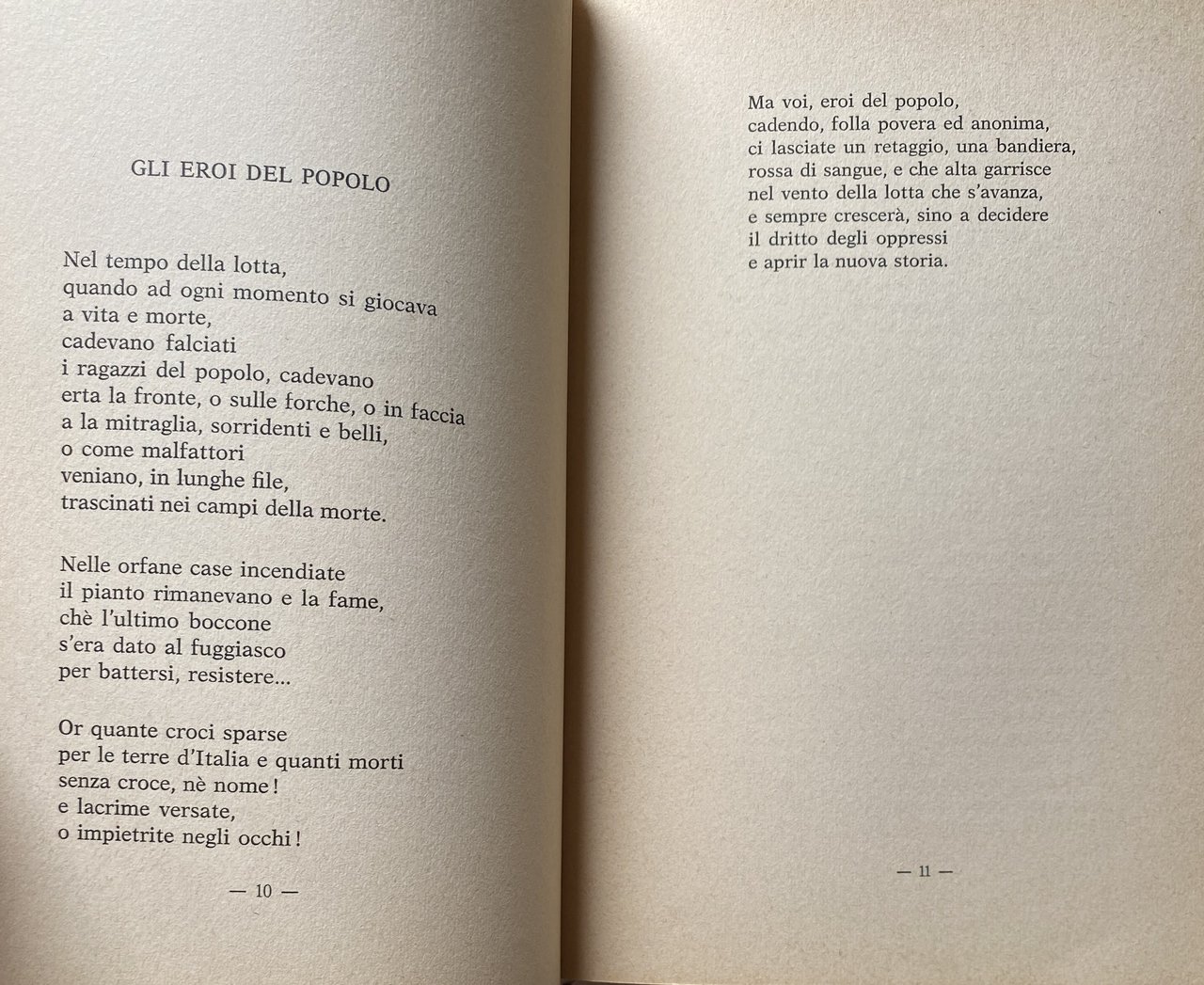 Soggetti: Resistenza Poesie Raccolte poetiche Antologie Ideologie politiche Antifascismo Partigiani Canti Memorie Racconti Liriche Poesia resistente Collezionismo Comunismo Lotta politica Impegno Staffette Storia contemporanea Seconda Guerra Mondiale Libri rari fuori catalogo Vintage da collezione Canzoni Eroismo Morte Fascisti Liberazione 25 Aprile Guerriglia Comunisti Italiani Donne Intrepide Roma 8 Settembre Armistizio Mussolini Badoglio RSI Repubblica sociale Salò Battaglie Nazismo nazisti Tedeschi Occupazione Nemici Patrioti Patriottismo Novecento Anni Quaranta Anni Cinquanta Fratelli Rosselli ANPI Brigate Fucilazioni Memoria civica Bende partigiane Condannati Valore civile Compagni Lettere Testimonianze Gestapo SS Eccidio Piazzale Loreto Preti Rastrellamenti Giustizia e Libertà Clandestinità Montagna Bella Ciao Fratellanza Mazzini Garibaldi Spagna Anarchici Militanti Guerra civile Emilio Lussu Combattenti GAP Bombe Attentati Resistance Poems Poetry collections Anthologies Political ideologies Anti-fascism Partisans Songs Memories Lyric stories Resistant poetry Collecting Communism Political struggle Commitment Relays Contemporary history Second World War Rare books out of print Collectibles Songs Heroism Death Fascists Liberation 25 April Guerrilla warfare Italian Communists Intrepid Women Rome 8 September Armistice Republic Battles Nazism Nazis Germans Occupation Enemies Patriots Patriotism Twentieth Century 1940s 1950s Brothers Brigades Shootings Civic Memory Partisan Bandages Condemned Civil Valor Comrades Letters Testimonies Massacre Piazzale Loreto Priests Raids Justice and Freedom Clandestine Mountains Brotherhood Spain Anarchists Militants Civil War Fighters Bombs Attacks Italy