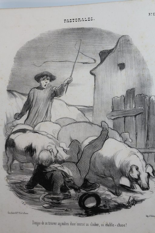 Lithographie originale en noir et blanc - Pastorales - Danger de se trouver au milieu d'une course au clocher, ou étable-chase !