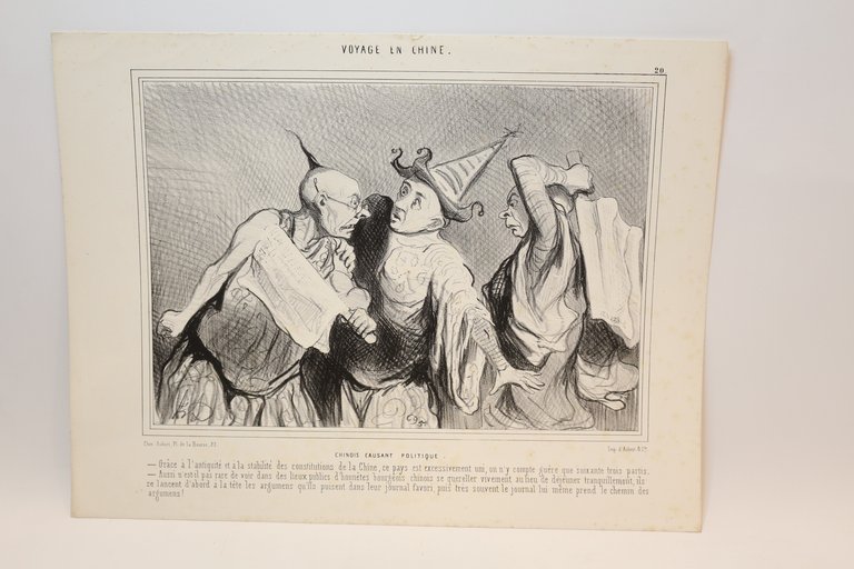 Lithographie originale en noir et blanc - Voyage en Chine - Chinois causant politique - Grâce à l'antiquité et à la stabilité des constitutions de la Chine, ce pays est excessivement uni.