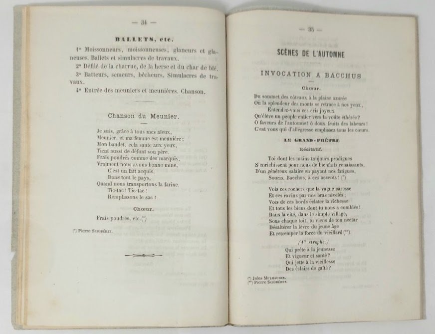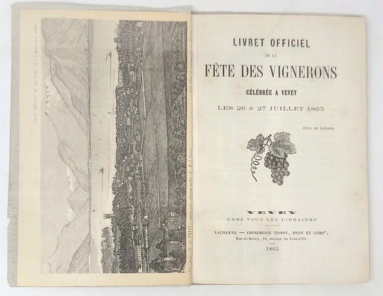 >in-8, pp. 78, in antiporta litografia "vue generale de Vevey". Brossura in carta muta. Programma ufficiale della Festa dei Vignerons, organizzata dalla Confrérie des Vignerons di Vevey fin dal 1797 per celebrare la cultura enologica e premiare i migliori viticoltori. Edizione originale in perfetto stato di conservazione.