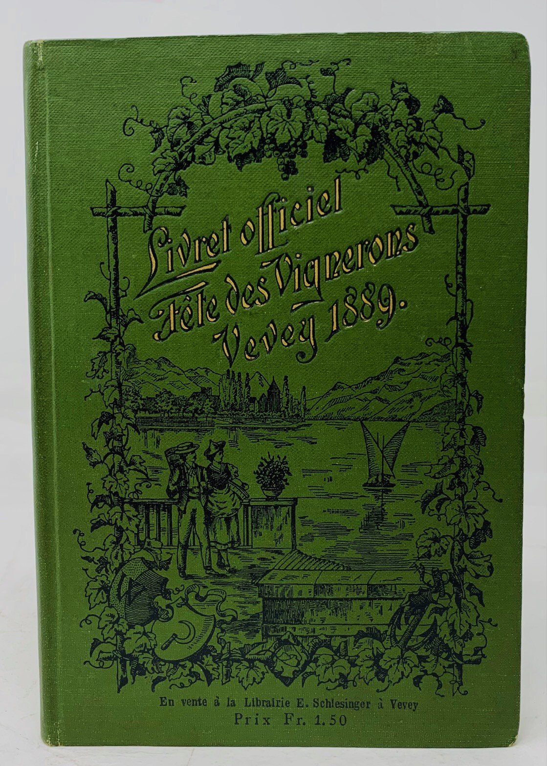 > in-8 (180X125mm) pp. 96. Bellissima legatura editoriale figurata in percallina verde, titolo oro al piatto superiore. Non comune publicazione con il programma della festa dei Vignerons tenutasi a Vevey il giorno 8 e 9 Agosto 1889. Contiene: Notizie su Vevey, Cenni storici sulle origini della festa, il programma completo con gli inni etc; illustrato da 2 tavole fotografiche della città. In perfetto stato di conservazione.