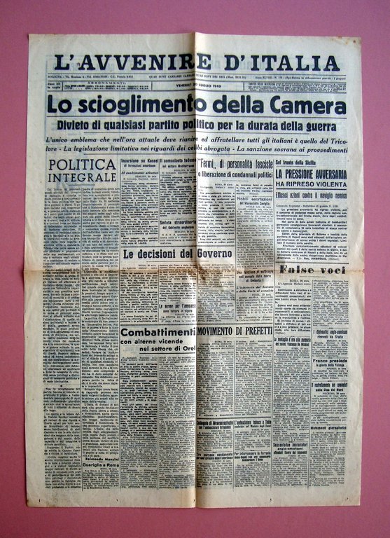 Lo Scioglimento della Camera L'Avvenire d'Italia 30/7/1943