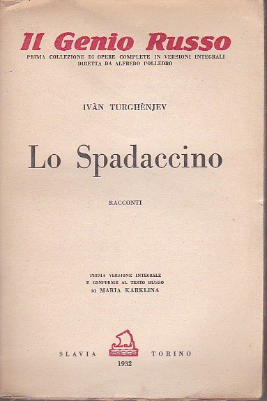 In-8°, pp. 277, (3) + (12) di catalogo editoriale su carta verdina, brossura editoriale. Ottimo stato. Prima edizione italiana. Il volume comprende: Lo spadaccino, Tre ritratti, Pjetuskov e Diario di un uomo superfluo. Il Genio Russo. Prima collezione di opere complete in versioni integrali diretta da Alfredo Polledro.