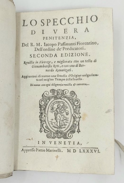 >in-8, ff. (8), 157, (4, gli ultimi 2 bb.), leg. coeva p. perg. molle, tit. ms. al dorso, tracce di bindelle. Impresa tip. sul tit. ed in fine, testo in car. tondo. Dedica di Leon. Salviati a Baccio Valori. Edizione "ricercata, essendosi in essa impresso per la prima volta il Volgarizzamento dell'Omelia di Origene" (Gamba 705). Quarta edizione (non "seconda", come dice il titolo; la prima era apparsa nel 1495) di questa celebre opera, testo di lingua, del frate domenicano (nato probabilmente a Firenze nel 1302 ed ivi morto nel 1357), la quale raccoglie i quaresimali predicati in vari anni, ma soprattutto nel 1354. Di particolare interesse per la storia dei costumi popolari dell'epoca gli aneddoti, i racconti e gli "esempi" riferiti con forma semplice ed armoniosa. Bellissimo esempl. Ediz. mancante a STC e Adams. Razzolini 262 (altre ediz.).