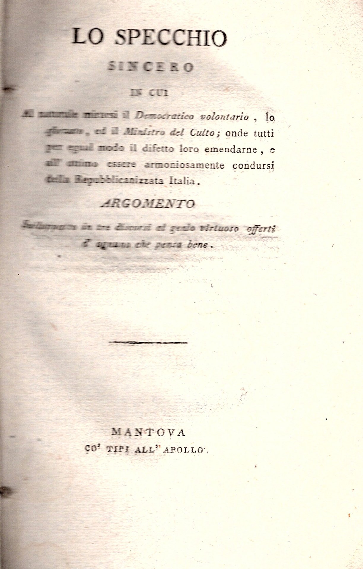 Lo specchio sincero in cui al naturale mirarsi il Democratico volontario, lo Sforzato e il Ministro del Culto; onde tutti per egual modo il difetto loro emendarne, e all'ottimo essere armoniosamente condursi della Repubblicanizzata Italia. ARGOMENTO sviluppato in tre discorsi al genio virtuoso offerti d'oguno che pensa bene