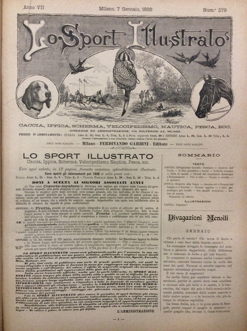 LO SPORT ILLUSTRATO - ANNO 1888 - VOLUME SETTIMO. - Settimanale di caccia, ippica, scherma, scacchi, velocipedismo, nautica, pesca, ecc. Esce ogni sabato.
