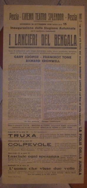 Locandina che annuncia la rappresentazione al Cinema Teatro "Splendor" di Pescia del film "I lancieri del Bengala". Domenica 18 settembre 1938.