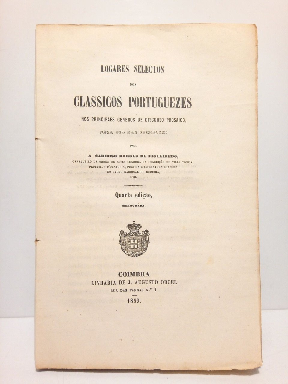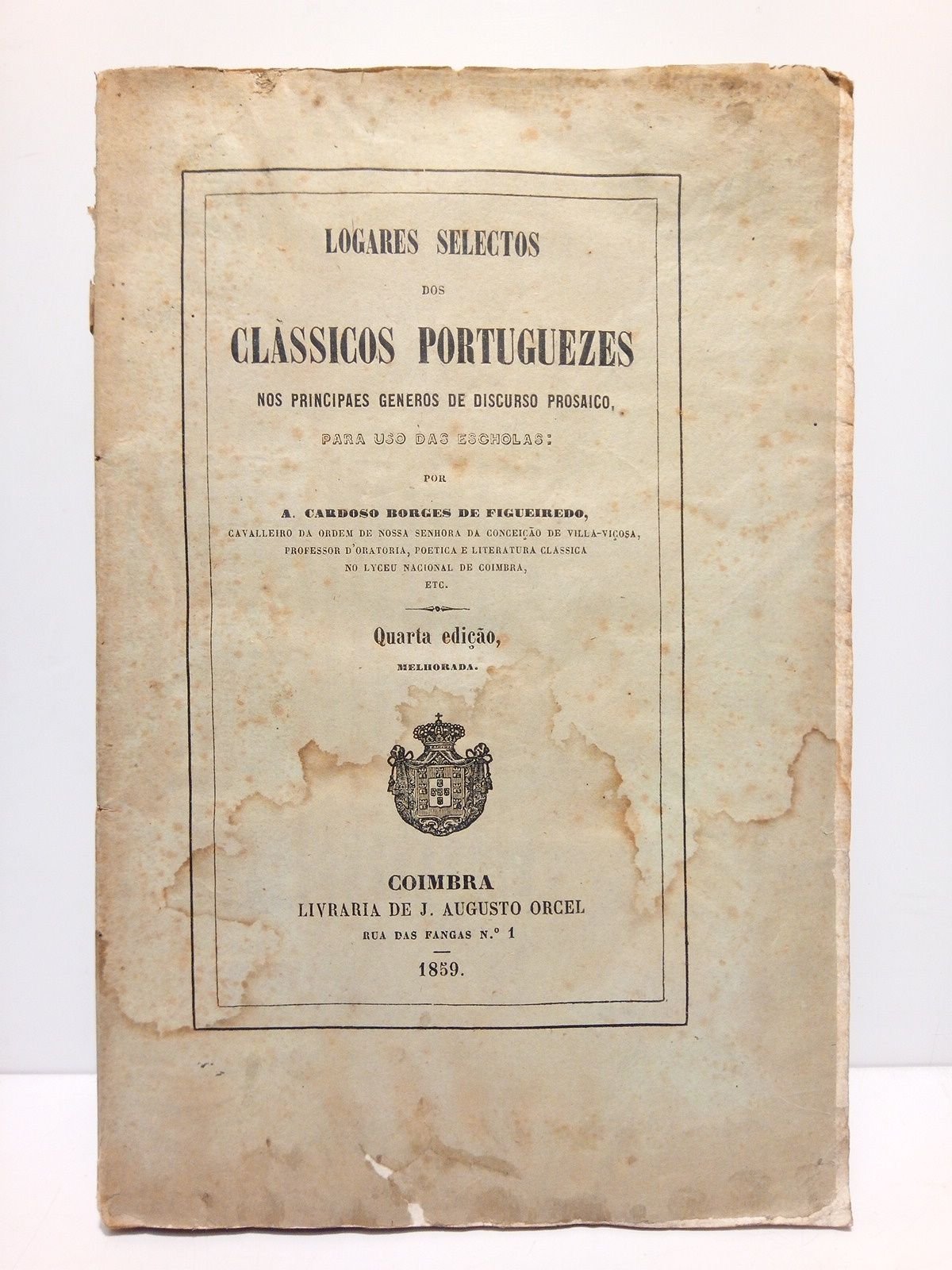 4ª Ed. melhorada.- Coimbra: Livraria de J. Augusto Orcel, 1859.- 294 p.; 4º (22,6 x 15 cm); Conservando todas sus barbas; Téxto en portugués; Rústica Ed.- Interesante libro de Pedagogía Nacional portuguesa para uso de las escuelas. RARO.* Cubiertas y portadilla con marcas de humedad, la cabeza de la lomera falta de untrozo. Por lo demás en buen estado, con el papel fuerte, limpio y blanco. PORTUGAL