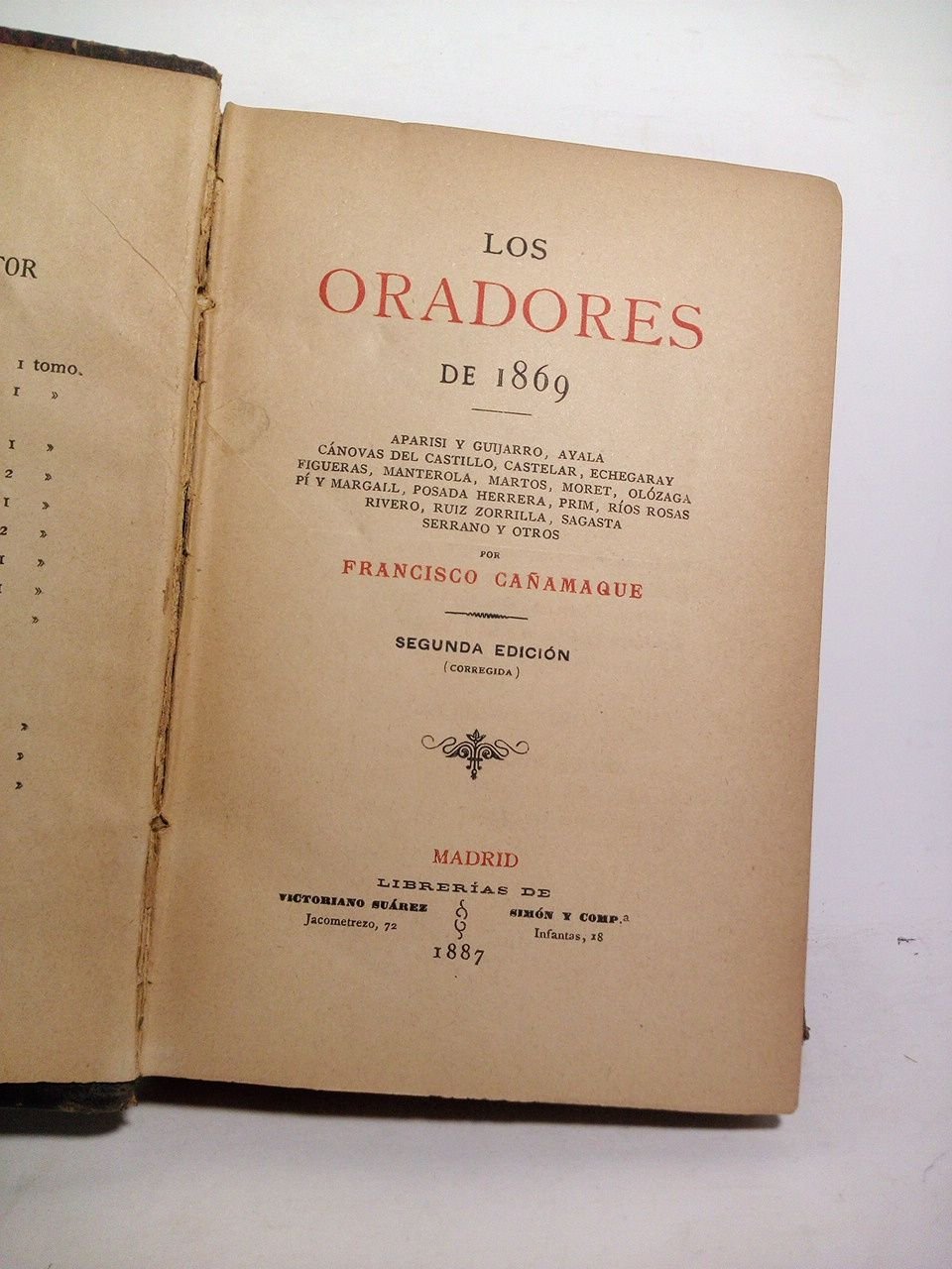 LOS ORADORES DE 1869: Aparisi y Guijarro, Ayala, Cánovas del Castillo, Castelar, Echegaray, Figueras, Manterola, Martos, Moret, Olózaga, Pí y Margall, Posada Herrera, Prim, Ríos Rosas, Rivero, Ruiz Zorrilla, Sagasta, Serrano y otros