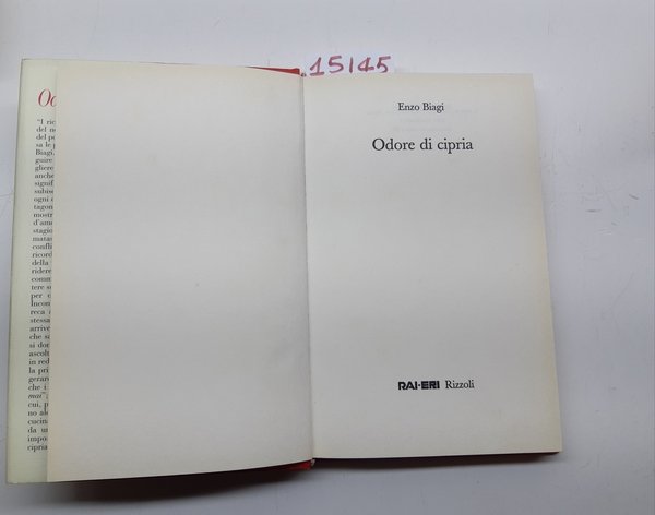 Odore di cipria Rizzoli 1∞ edizione 1999: sovraccoperta editoriale in discrete condizioni, alcune lievi sporcizie ed aloni, etichetta di catalogazione al dorso, legatura rigida in tela rossa con titoli in oro al dorso, alla seconda di copertina ex libris, tagli leggermente ingialliti con qualche fioritura, interno buono stato, fioriture alle pagine interne che non disturbano la lettura