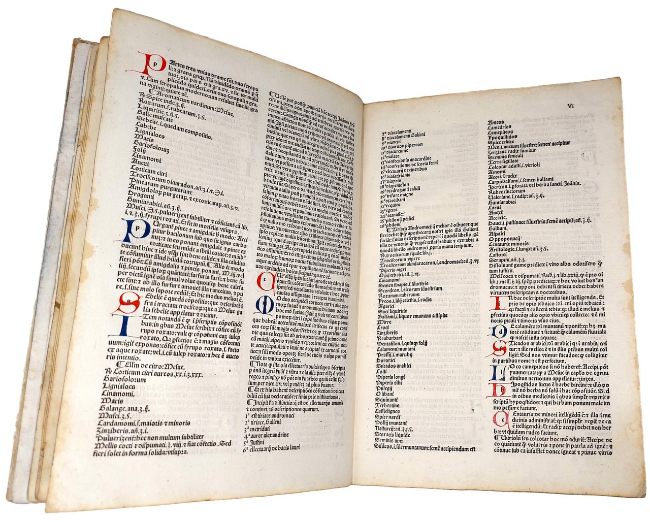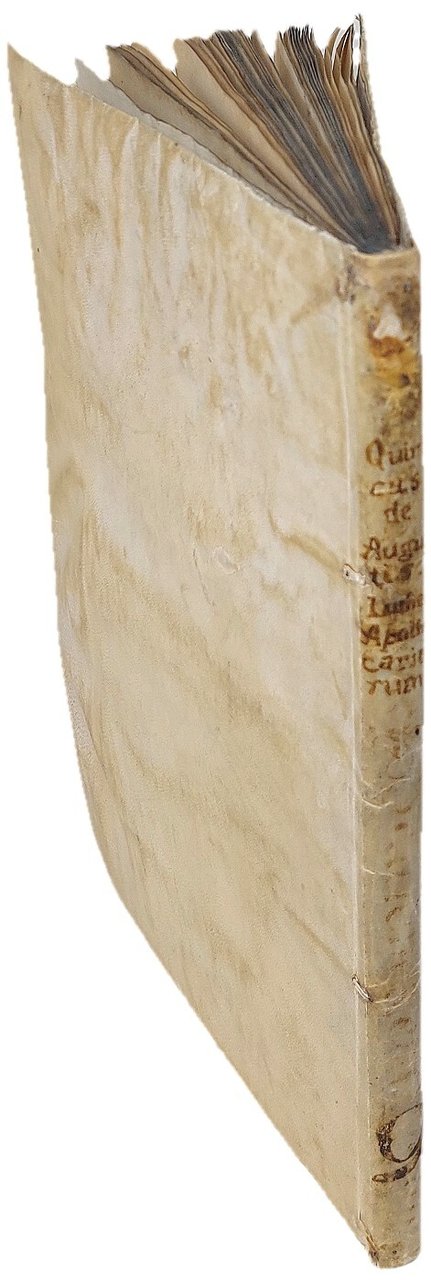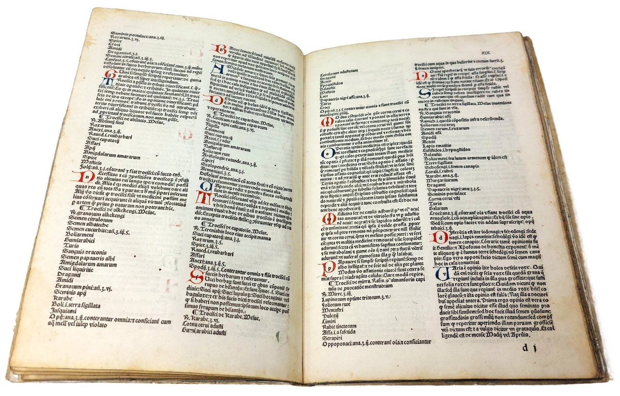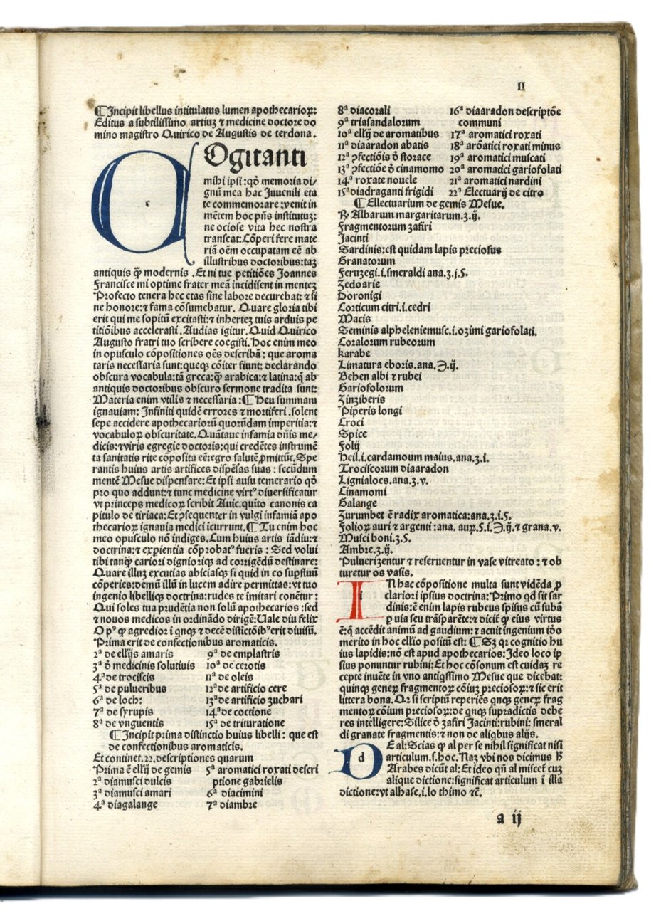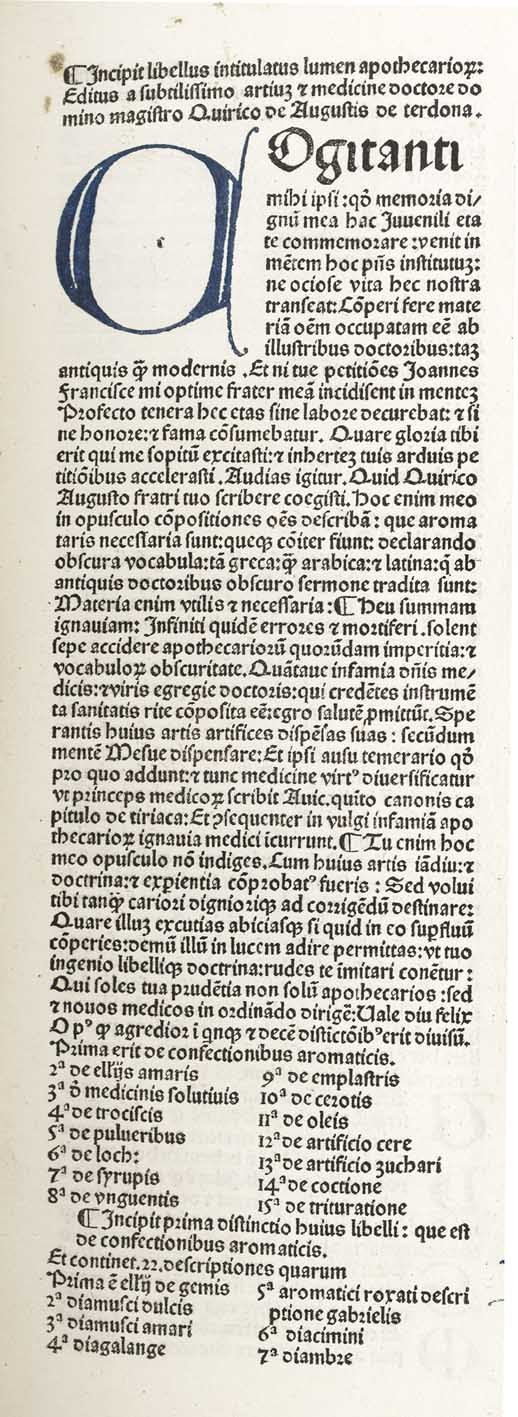 >in-folio (276x195 mm), ff. XXXVIII, (4), con segnat. a-e6, f-g4, (h4); legatura 500esca in pergamena floscia, titolo ms. al dorso. Impresa tipogr. in fine, testo su due colonne in car. semigotico, interamente rubricato in rosso e blu. Foglio a1: ''Lumen Apothecariorum''; f. a2: ''Incipit libellus intitulatus lumen apothecariorum:/ Editus a subtilissimo artium et medicine doctore do / mino magistro Quirico de Augustis de terdona. / Cogitanti...''; f. XXXVIII, g4 r., colophon: ''...Taurini impressum: per Nico / laum de benedictis hyspanum: et Jacobinum Suigum / Anno Salutis Mill.o uqadrigentessimo nonagessi / mo secundo: die quintadecima Februarij''. Dedica dell'autore al fratello Giovanni Francesco cui si dichiara riconoscente per averlo stimolato a non trascorrere nell'ozio la giovinezza. In fine un utile indice degli argomenti in ordine alfabetico. Editio princeps di questo trattato di farmacologia straordinariamente raro (3 soli esempl. in Italia: Milano, Torino e Venezia e nessun esempl. negli altri paesi europei ed in USA), contenente una quantità di formule dettagliate e di medicinali composti da un gran numero d'ingredienti (talvolta fino a trenta). L'opera, basata su fonti antiche e sugli scienziati arabi, quali Avicenna e Mesua, vuole aiutare i farmacisti nel chiarire oscure terminologie e nell'applicazione di droghe ed indica rimedi contro dolori di stomaco, di testa, agli occhi, ecc. e vari benefici per i disturbi dell'umore. L'applicazione di ingredienti esotici (quali oppio, rabarbaro, mandragora, cardamono, varie piante e pietre preziose) illustrano e documentano il commercio italiano delle droghe e la crescente conoscenza delle sostanze medicinali nel tardo medioevo. L'opera ebbe enorme successo, tanto da venir quasi, per così dire, consunta dall'uso dei farmacisti dell'epoca; fu ancora ristampata nel 1525 ed utilizzata nel corso di tutto il XVI secolo. Il piemontese Quirico degli Augusti, nato a Tortona intorno alla metà del XV sec., fu medico di Margherita, figlia di Carlo, duca del Borbonese, e moglie di Filippo ''senza terra'', allora conte di Bresse, poi duca di Savoia; verso la fine del secolo esercitò l'arte medica a Vercelli. Esemplare puro e marginoso, con al verso dell'ultimo foglio una ricetta manoscritta in italiano d'inizio XVI secolo. In virtù del suo "carattere di rarità e pregio, dello stato di conservazione, della legatura cinquecentesco e delle rubriche a colori" l'esemplare è stato notificato come di "importante interesse per il patrimonio librario nazionale: rarissimo incunabolo e suberbo cimelio dell'arte tipografica torinese". Non in Wellcome e Adams. IGI 1072. Klebs 122.1. Hain 2118. GW 3063. Cfr. Manzoni, Annali tipogr. torinesi, pp. 62-5. Malacarne, Opere de' medici e cerusici...negli Stati di Casa Savoia, p. 162.