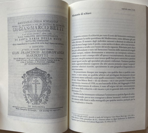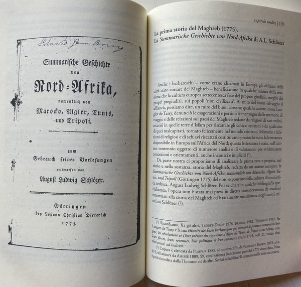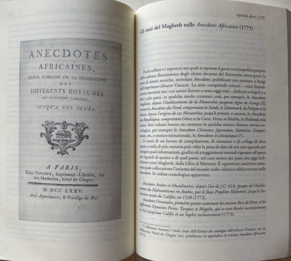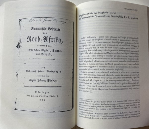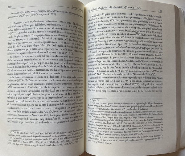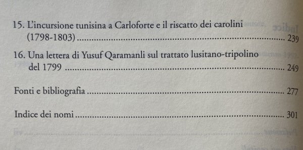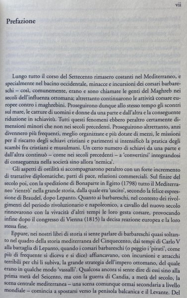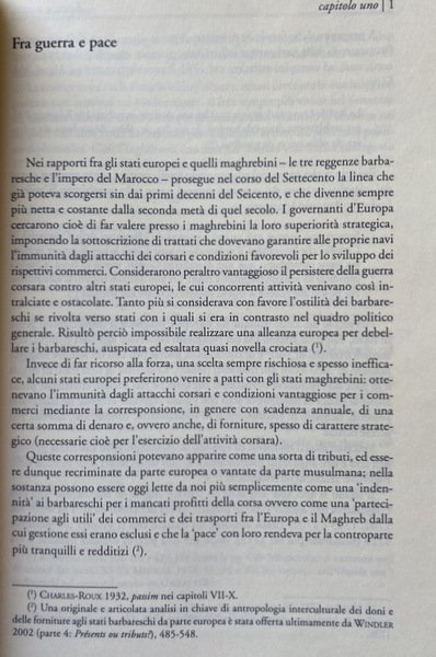 Soggetti: Guerra, Pace, Ambasciatori, Consoli, Viaggiatori, Mercanti, Saggi, Studi storici, Storia antica, medievale e moderna, Storia filosofica e politica, Stabilimenti, Commercio, Europei, Due Indie, Atti consolari, Regno delle Due Sicilie, Minacce corsare sulle coste europee e maghrebine, Africa, Relazioni internazionali, Marocco, Trattati, Afrique, Tripoli, Principe Regente de Portugal, Remigio Pupares, Corsari barbareschi, Mar Mediterraneo, Turchia, Impero Ottomano, Medioevo, Portogallo, Colonialismo, Imperialismo, Saccheggio, Sardegna, Diplomazia, Scambi commerciali, Spezie, Mercato, Illuminismo, Islam, Cristianesimo, Mentalità, Rapporti diplomatici, Chiesa, Religione, Scontri, Biografia, Memorie, Storiografia, Yusuf Qaramanli, Omicidi, Delitti, Schiavitù, Liberazione, Rivolte, Sudditi, Famiglie, Nobili, Nobiltà, Aristocrazia, Paternò, Sicilia, Siciliani, Sardi, Aneddoti, Deux Indes, Summarische Geschichte, Afrika, August Ludwig Schlözer, Marino Doxarà, Carloforte, Carolini, Stemmi, Lusitania, Portoghesi, Bibliografia, Riferimento, Documenti, Consultazione, Saggistica, Libri Vintage Fuori catalogo, Napoleone Bonaparte, Spedizioni, Attacchi, Navi, Assalti, Pirati, Pirateria, Reportage, Abate Thomas François Raynal, Carlo Antonio Stendardi, Medio Oriente, Lettere, Corrispondenza, Epistolari, Archivio, Vaticano, Soldatesche, Galere, Geografia, Doni, Forniture, Trasporti, Corsa, Profitto, Utili, Partecipazione, Crociate, Ostilità, Gran Bretagna, Danimarca, Norvegia, Inghilterra, Impero asburgico, Austria, Germania, Italia, Amburgo, Ordine di Malta, Corsica, Tripoli, Algeri, Venezia, Mossner, Peric, Babinger, Baasch, Arabi, Milizie, Peste, Malattie, Gian Marco Betti, Genova, Genovesi, Ragguaglio, Avventure, Mercedari, Lucia Scaraffia, Conversione, Rinnegati, Identità, Cristianità, Rais, Haggi Embarek, Mawlay Ismail, Muley Ismael, Maometto, Anectodes Aneddoti cinesi, africani, Anecdotes chinoises, japonoises, siamoises, tonquinoises, Ecclésiastiques, Arabes, Musulmanes, Vincent, Souverains, Perse, Sirie, Persia, Siria, Iran, Egyptiennes, Egiziani, Egitto, Algerini, Abyssinies, Tunisiennes, Mori, Moeurs, Usages, Coutumes, Religions, Tunisia, Gazette de France, Gesuiti, Resoconti, Viaggio, Gabriel Esquer, Usi, Costumi, Religioni, Anticolonialismo, Glauco Ciammaichella, Biografie, Confraternite, Descrizioni, Libia, Kelibia, Lampedusa, Famiglie illustri, Grecia, Zante, Andrea Maria Querini, Governo del Regno, Giornale, Tully, Narrative, Letters, Marocco, Alessandria, Alì Pascià bey, Baleari, Baba Ali, Baghdad, Babilonia, Braudel, Barcellona, Spagna, Cagliari, Cadice, Donald Campbell, Cardoso de Moraes, Savoia, Borboni, Istanbul, Costantinopoli, Ferdinando di Borbone, Livorno, Sublime Porta, Meknès, Marsiglia, Mohammed ben Beker, ben Abdallah, Palermo, Paesi Bassi, Napoli, Pantelleria, Ernesto Pontieri, Sainte-Beuve, Pier Domenico Salani, Salé, Sant'Antioco, Sicart, Amurat Bey, Sousse, Taillerand, Vanvitelli, War, Peace, Ambassadors, Consuls, Travelers, Merchants, Essays, Historical studies, Ancient, medieval and modern history, Philosophical and political history, Establishments, Commerce, Europeans, Two Indies, Consular acts, Kingdom of the Two Sicilies, Corsair threats on the coasts European and Maghreb, Africa, International relations, Morocco, Treaties, Principe Regente de Portugal, Remigio Pupares, Barbary Corsairs, Mediterranean Sea, Turkey, Ottoman Empire, Middle Ages, Portugal, Colonialism, Imperialism, Sacking, Sardinia, Diplomacy, Trade, Spices, Market, Enlightenment, Christianity, Mentality, Diplomatic relations, Church, Religion, Clashes, Biography, Memories, Historiography, Murders, Crimes, Slavery, Liberation, Revolts, Subjects, Families, Nobles, Nobility, Aristocracy, Sicily, Sicilians, Sardinians, Anecdotes, Coats of Arms, Lusitania, Portuguese, Bibliography, Reference, Documents, Consultation, Non-fiction, Out of print books, Expeditions, Attacks, Ships, Assaults, Pirates, Middle East, Correspondence, Epistolary, Archive, Vatican, Soldiersche, Prisons, Geography, Gifts, Supplies, Transport, Travel, Profit, Useful, Participation, Crusades, Hostility, Great Britain, Denmark, Norway, England, Habsburg empire, Germany, Italy, Hamburg, Order of Malta, Tripoli, Algiers, Venice, Arabs, Militias, Plague, Diseases, Genoa, Genoese, Ragguaglio, Adventures, Mercedari, Conversion, Renegades, Identity, Christianity, Muhammad, Chinese anecdotes, Africans, Sovereigns, Perse, Syria, Egyptians, Egypt, Algerians, Moors, Jesuits, Reports, Travel, Uses, Customs, Religions, Anti-colonialism, Biographies, Confraternities, Descriptions, Libya, Famous families, Greece, Zakynthos, Government of the Kingdom, Newspaper, Morocco, Alexandria, Balearics, Babylon, Barcelona, Spain, Cadiz, Savoy, Bourbons, Constantinople, Ferdinand of Bourbon, Marseille, Netherlands, Naples