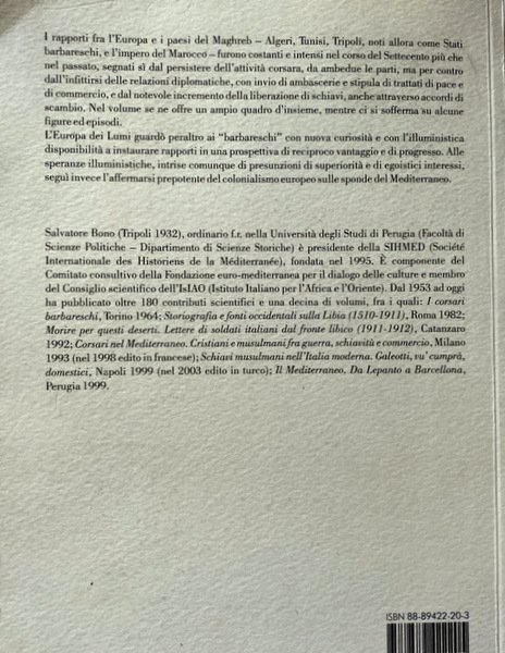 I rapporti fra l'Europa e i paesi del Maghreb – Algeri, Tunisi, Tripoli, noti allora come Stati barbareschi, e l'impero del Marocco – furono costanti e intensi nel corso del Settecento più che nel passato, segnati sì dal persistere dell'attività corsara, da ambedue le parti, ma per contro dall'infittirsi delle relazioni diplomatiche, con invio di ambascerie e stipula di trattati di pace e di commercio, e dal notevole incremento della liberazione di schiavi, anche attraverso accordi di scambio. Nel volume se ne offre un ampio quadro d'insieme, mentre ci si sofferma su alcune figure ed episodi. L'Europa dei Lumi guardò peraltro ai “barbareschi” con nuova curiosità e con l'illuministica disponibilità a instaurare rapporti in una prospettiva di reciproco vantaggio e di progresso. Alle speranze illuministiche, intrise comunque di presunzioni di superiorità e di egoistici interessi, seguì invece l'affermarsi prepotente del colonialismo europeo sulle sponde del Mediterraneo.