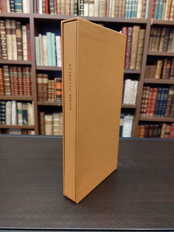 In-8° stretto (cm. 25,2), pagine 129 [7] composte in Caslon, frontespizio in rosso e nero, 6 figure ripiegate nel testo tratte dalle xilografie dell'edizione di Pierre Levet (Parigi 1490). Esemplare n. 762 su carta Lana dei mille editoriali. Brossura officinale a risvolti, titolo al piatto con gli stessi inchiostri del frontespizio, titolo in rosso al dorso, camicia e astuccio cartonati di colore grigio. Raffinata edizione talloniana di questo anonimo capolavoro del teatro comico medievale, introduzione di Jean Porcher. Cfr. Pellizzari 21. Ottimo esemplare.