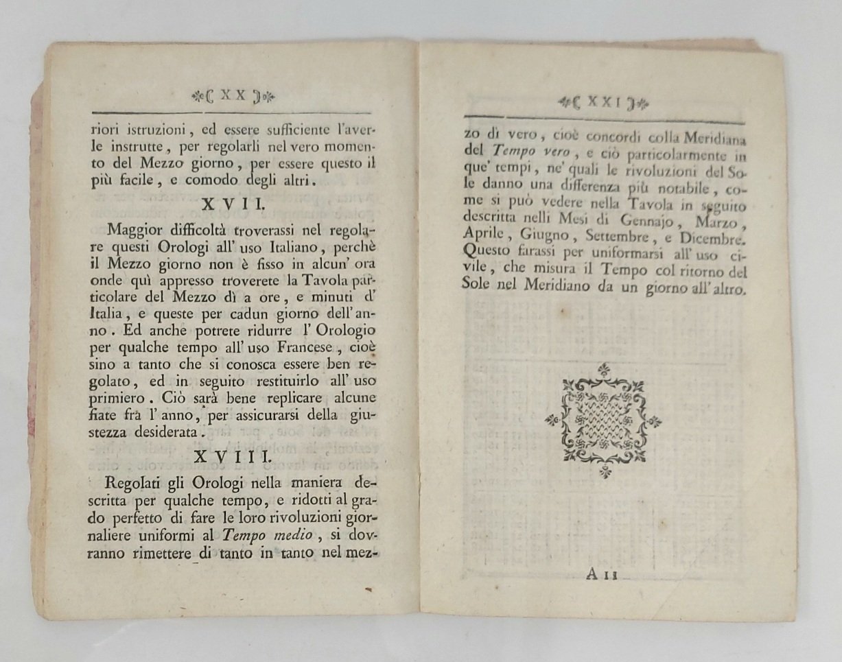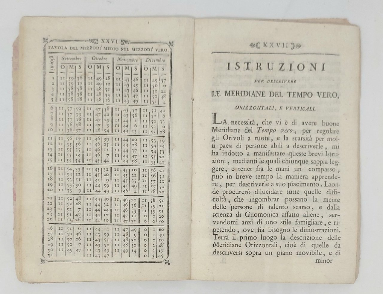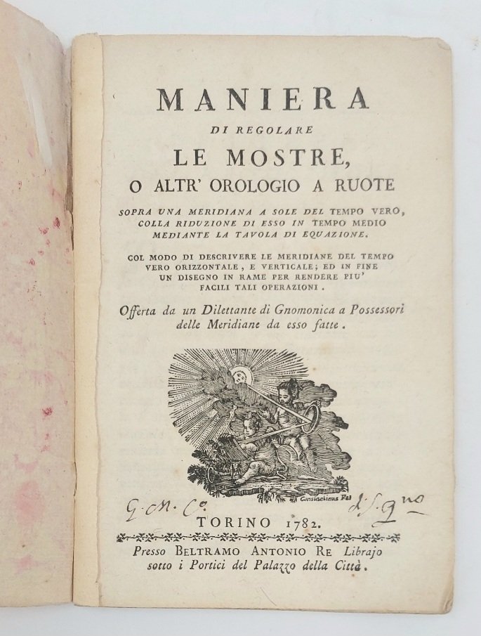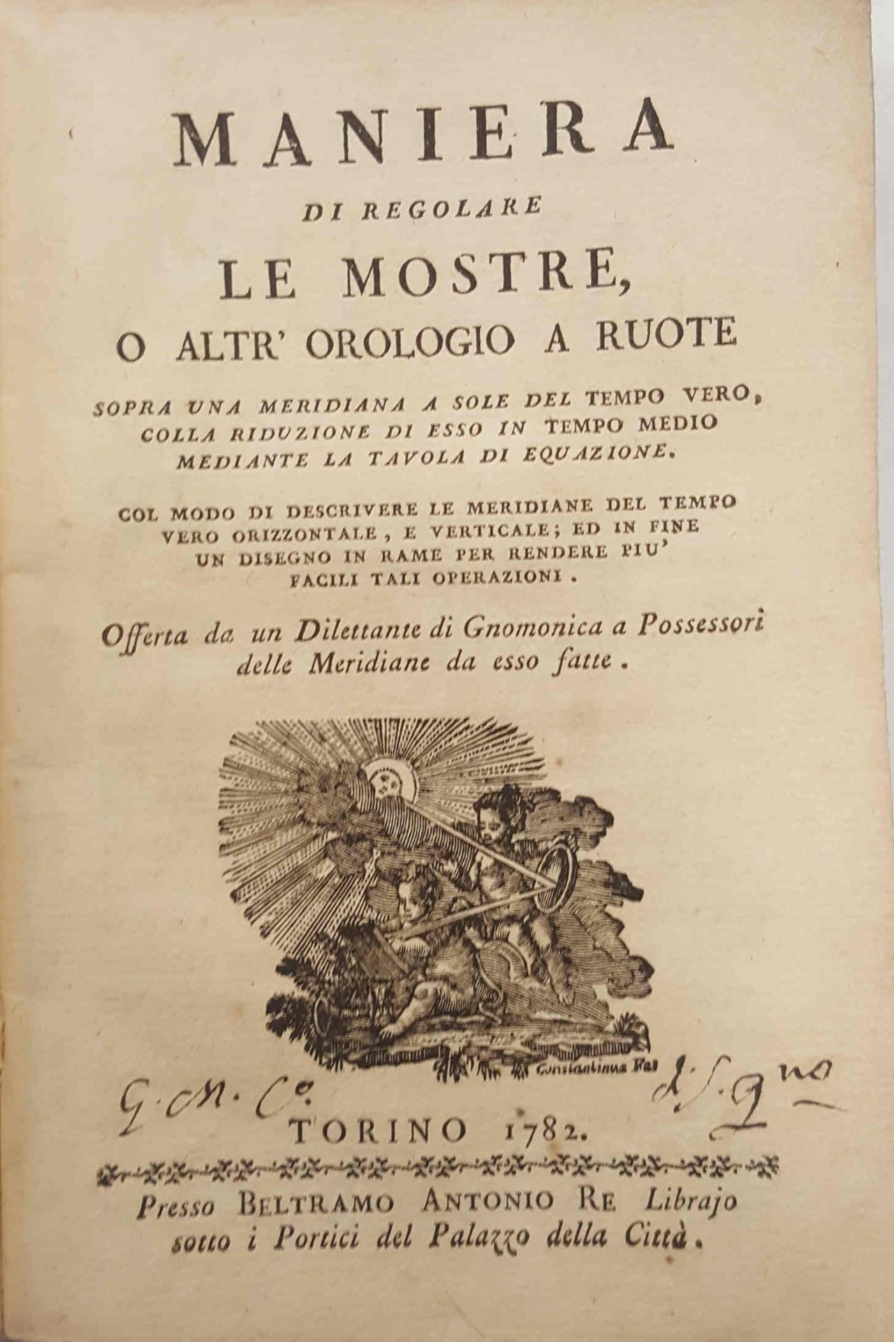 >in-8, pp. XLV, (3), 1 tavola incisa in rame ripiegata f.t., vignetta al frontespizio, brossura in bella carta decorata coeva. Edizione originale di questa istruzione pratica (probabilmente di un orologiaio) su come regolare orologi meccanici (definiti con il piemontesismo "mostra") su una meridiana. Le ultime tre pagine n.n. riportano il catalogo dello stampatore. Rarissimo. Ottimo e fresco esemplare. BAILLIE, p. 316 lo riporta, ma afferma di non essere riuscito a trovarne una copia.