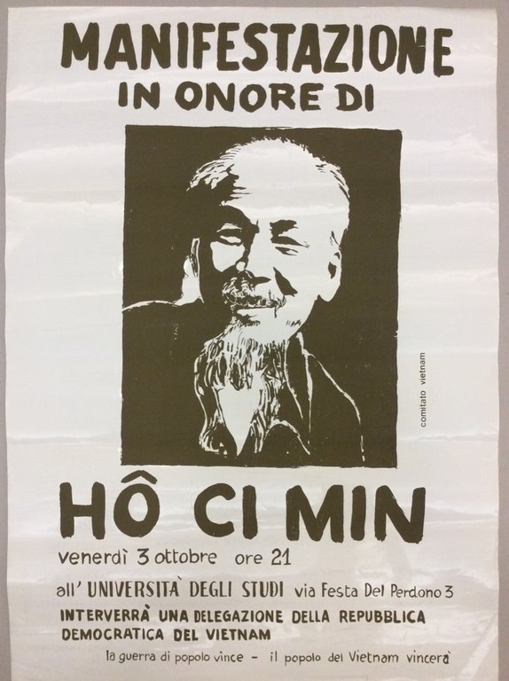 Manifesto litografico (cm. 70x70), stampato su carta lucida, con un'immagine di Ho Chi Minh al centro e titoli verde scuro su fondo bianco.Alla manifestazione interverrà una delegazione della Repubblica Democratica del Vietnam. In calce lo slogan la guerra di popoli vince - il popolo del Vietnam vincerà.Ben conservato.