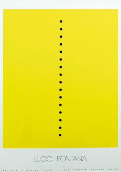 >Manifesto originale serigrafico cm 69 x 50. Rettangolo giallo stampato in serigrafia su carta perforata. Variante di colore giallo, (esistono esemplari tirati in rosso, blu o verde). Esemplare in discreto stato di conservazione (piccole imperfezioni). Lucio Fontana (Rosario, 19 febbraio 1899 – Comabbio, 7 settembre 1968) è stato un pittore, ceramista e scultore italiano, fondatore del movimento spazialista. Il primo testo teorico alla base della nascita dello Spazialismo è stato ideato da Fontana nel 1946 a Buenos Aires, in Argentina: il cosiddetto ''Manifiesto Blanco'', dove si iniziano a delineare le urgenze di un superamento dell'arte come sino ad allora concepita e ormai ''stagnante'', inserendo le dimensioni del tempo e dello spazio. I pittori spazialisti non hanno come priorità il colorare o dipingere la tela, ma creano su di essa delle costruzioni che mostrano agli occhi del passante come, anche in campo puramente pittorico, esista la tridimensionalità.