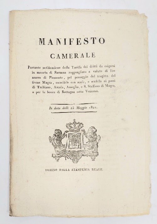 Manifesto camerale portante notificanza della tariffa dei dritti da esigersi in moneta di Sarzana ragguagliata a valute di lire nuove di Piemonte, pel passaggio del tragitto del fiume Magra, esercibile con scafe, e scafelle... In data delli 25 maggio 1821.
