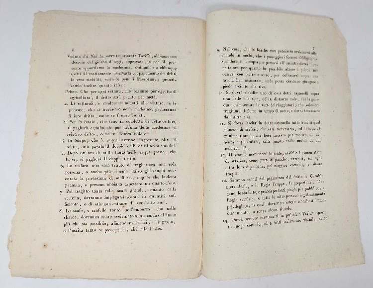 > in-4, pp. 8, grande stemma sabaudo xilogr. al titolo. Rarissimo documento, emesso dalla Regia Camera dei Conti, che emana le tariffe di passaggio lungo il Fiume Magra "ai passi di Trebiano, Arcola, Ameglia, e S. Steffano di Magra, e per la bocca di Bottagna sotto Vezzana". Interessante fonte storica sul territorio della Lunigiana. Ottimo esemplare.