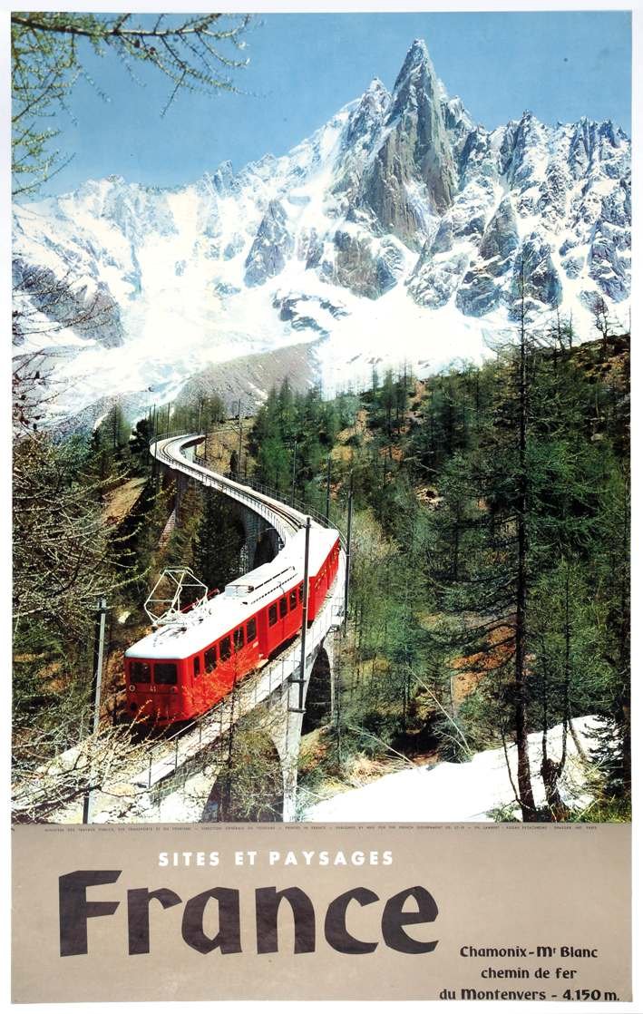>Manifesto offset intelato, cm. 103x67. Manifesto turistico per la promozione dei siti alpini. La ferrovia a cremagliera da Chamonix a Montenvers attraversa la Mer de Glace; sullo sfondo i ghiacciai savoiardi e le famose Aiguilles du Dru. Esemplare ben conservato.