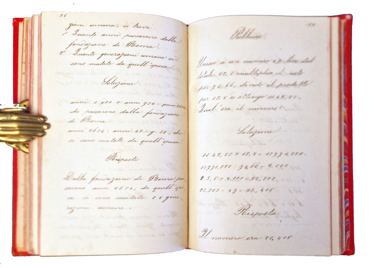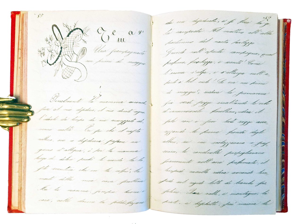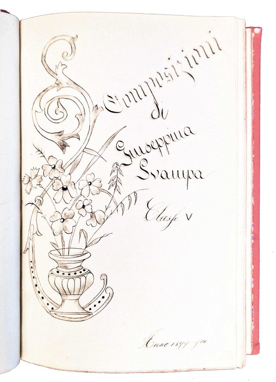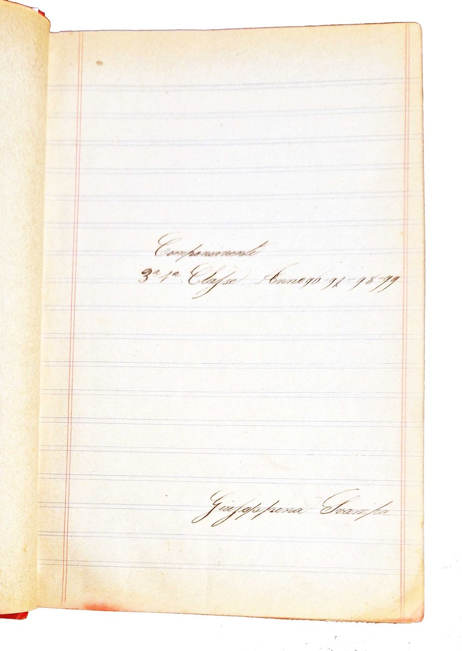Un volume manoscritto, dim. 200x130 mm, leg. rigida in tela percalina rossa, con decori impressi al piatto anteriore, titolo e autore impresso e dorato al piatto anteriore, guardie in carta marmorizzata, tagli colorati di rosso; pp. (4), 82, (2), 172, (4), 76, (4), 81, (3). Le prime 84 pagine sono scritte su carta a righe da scuola media. Manoscritto tutto della stessa mano tra il 1896 e il 1899, composto da quattro parti (la seconda è ricca di finissimi disegni), ognuna della parti è preceduta da una pagina col titolo: "Componimenti 3^, 4^ classe, anno 96-97-98-99. Giuseppina Svampa"; "Composizioni di Giuseppina Svampa, classe V, anno 1899-900"; "Aritmetica, 3^, 4^, 5^ classe"; "Second cours de langue francais, exercises". All'inizio della prima parte sono riportati data e luogo (Fermo, 12.12.98). Cond.: Segni d'uso alla legatura (abrasioni agli angoli, leggere spaccature alla tela in corrispondenza delle cerniere, presenza di alcune macchie e scoloriture). Carte pulite. Esemplare in buone condizioni generali.